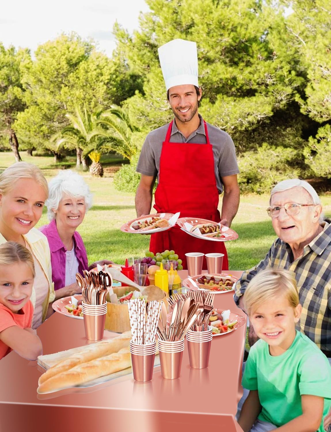 • 【Serve 20 Guests in Style】This elegant party dinnerware set includes 20 pieces of 9" dinner plates, 20 pieces of 7" dessert plates, 20 pieces of 9oz cups, 20 luncheon napkins (3-ply, 6.5" x 6.5"), and 20 sets heavy-duty rose gold plastic utensils (20 forks, 20 spoons, 20 knives) and 1 sheet tablecloth to complete your table setting.