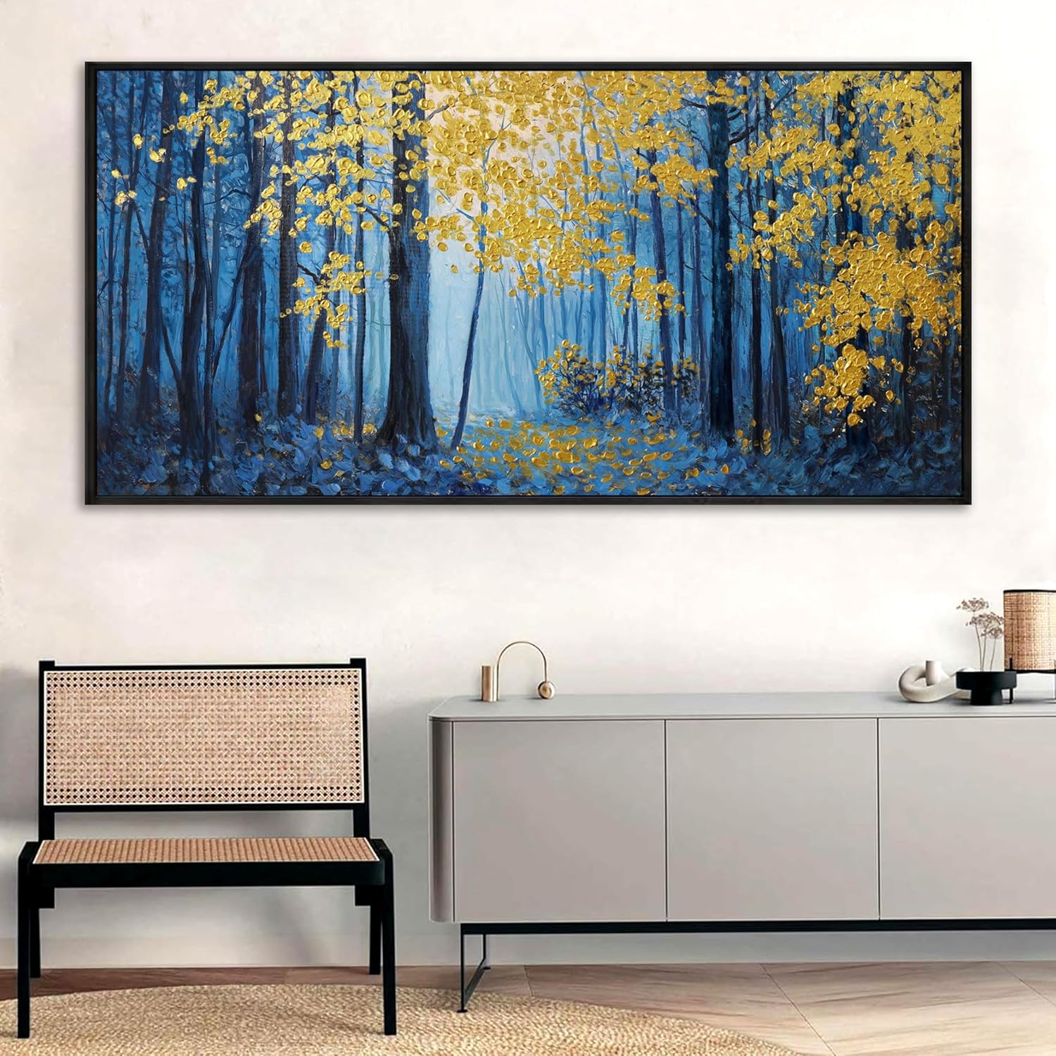 KLAKLA Blue and Gold Tree Wall Art - Birch Tree Forest Painting Pictures Framed Artwork for Living Room Bedroom Office Canvas Print Art Gorgeous Landscape Wall Art Home Decoration - 58x29 Inches