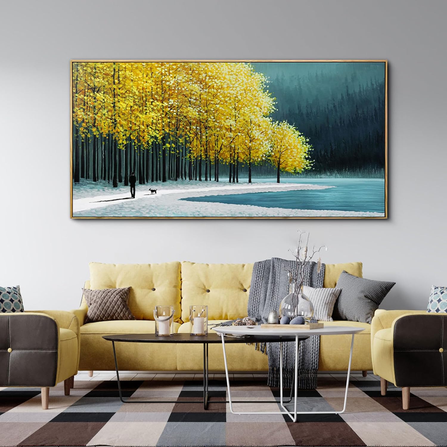 KLAKLA Large Wall Art - Yellow Bedroom Birch Tree Valley Snowy Forest Wild Lakes Landscape Canvas Pictures Wall Decoration for Living Room Office Home Decor - 48x24 Inches