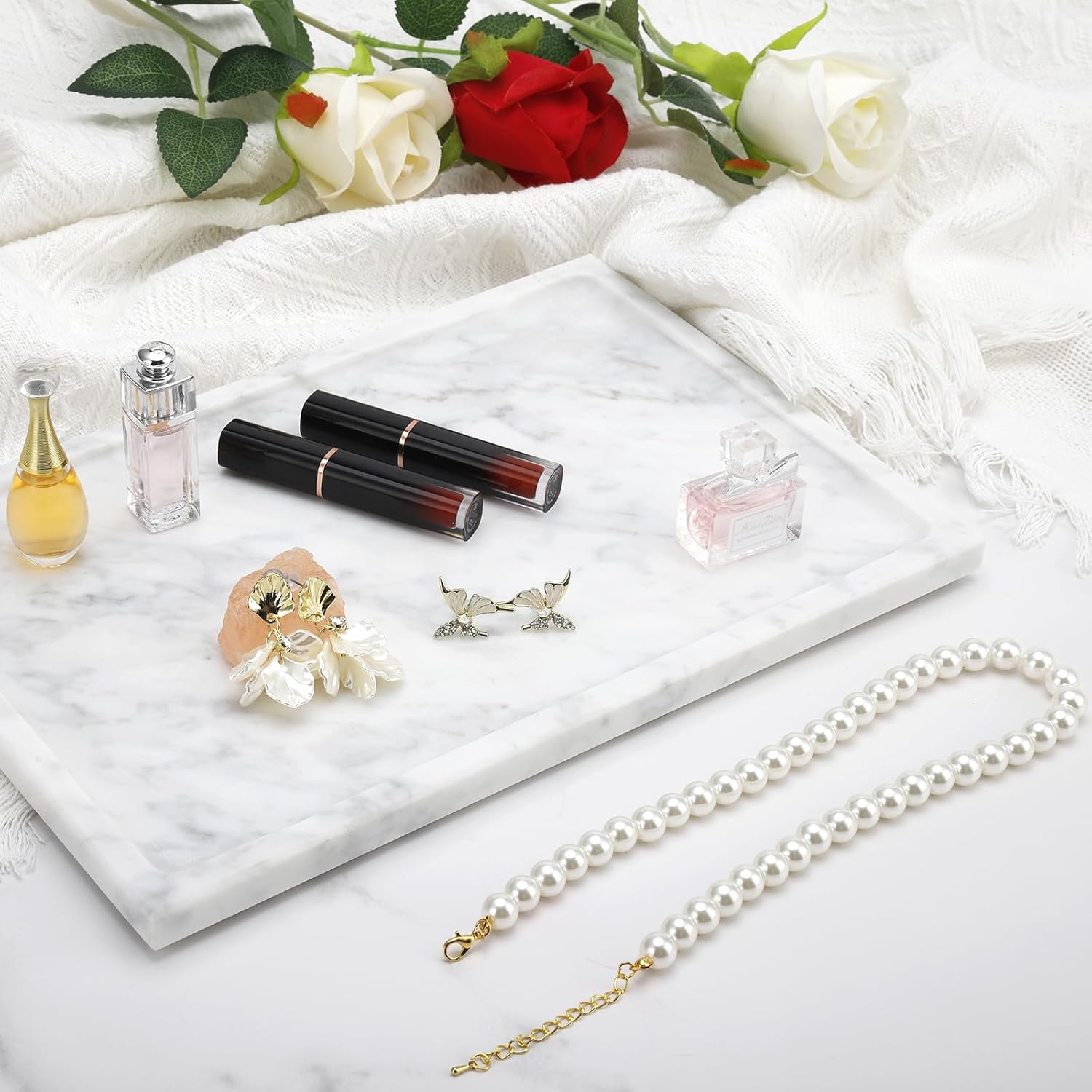 • Versatile Storage and Display Tray:Perfect as a vanity tray for cosmetics, perfumes, and jewelry, or a decorative tray for candles and toiletries, adding both style and functionality to any space.