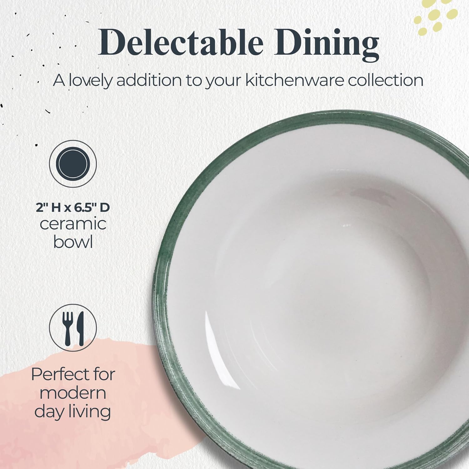 • Classic Brushstroke Design: Features a wide and narrow green brushstroke around the rim of each white oatmeal bowl, bringing a touch of traditional style that complements both modern and classic decors. Ideal for layered table settings.