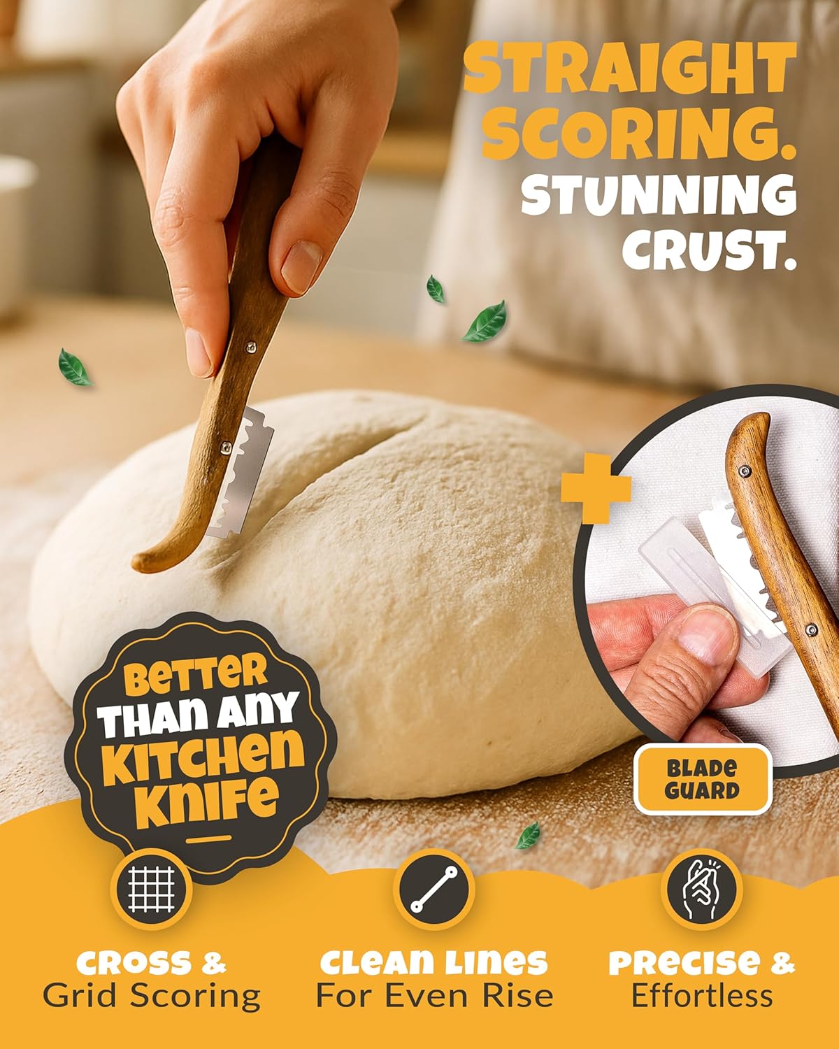 • RAZOR-SHARP SOURDOUGH BLADE SCORER – This dough scoring knife delivers clean, deep cuts for beautiful designs. Works as bread razor for sourdough bread or as a precision scoring knife for bread baking