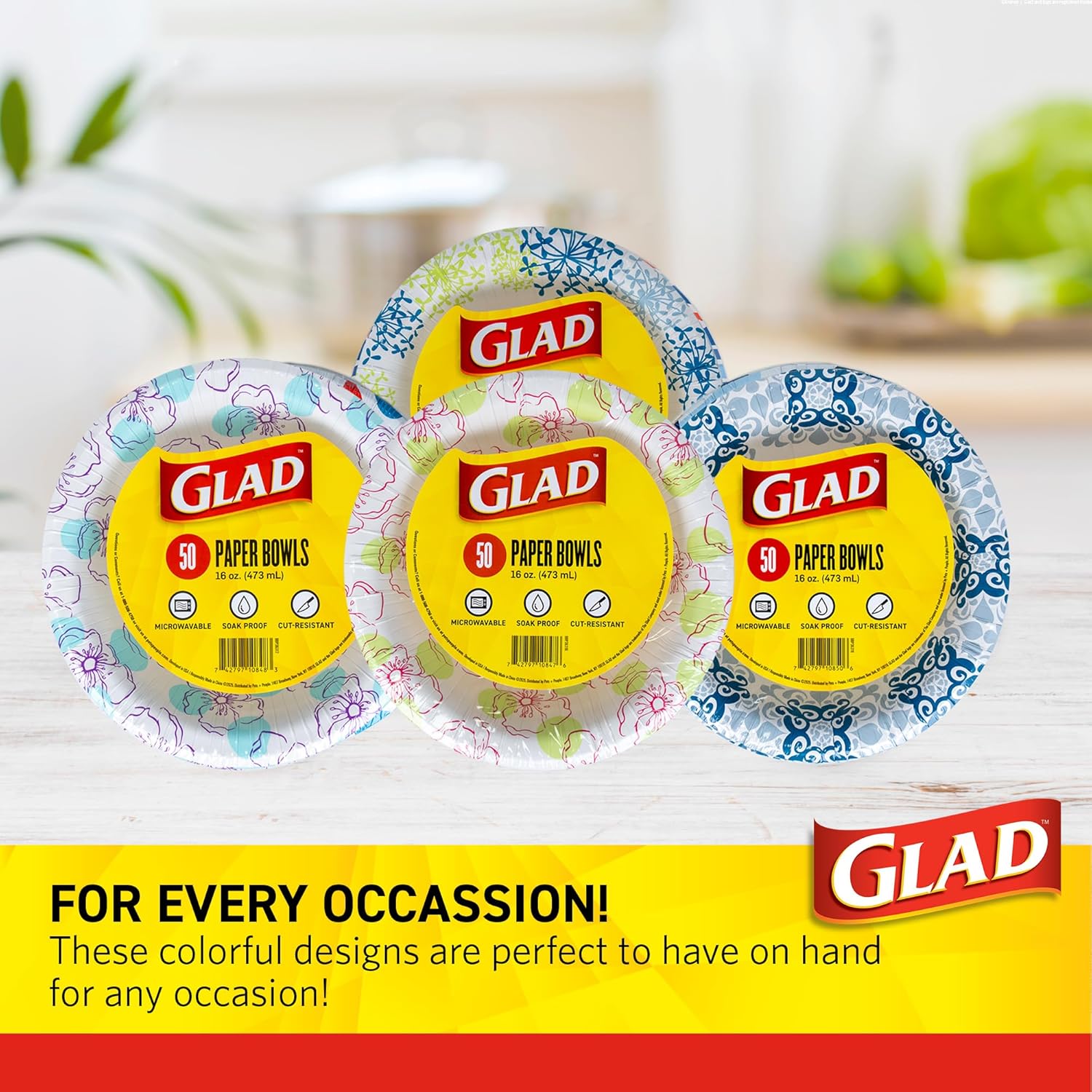 Glad Round Disposable Paper Bowls, Blue Flower Design - Heavy Duty, Soak Proof, Cut-Resistant, Microwavable Bowl for All Foods & Daily Use, 16 Oz, 50 Count