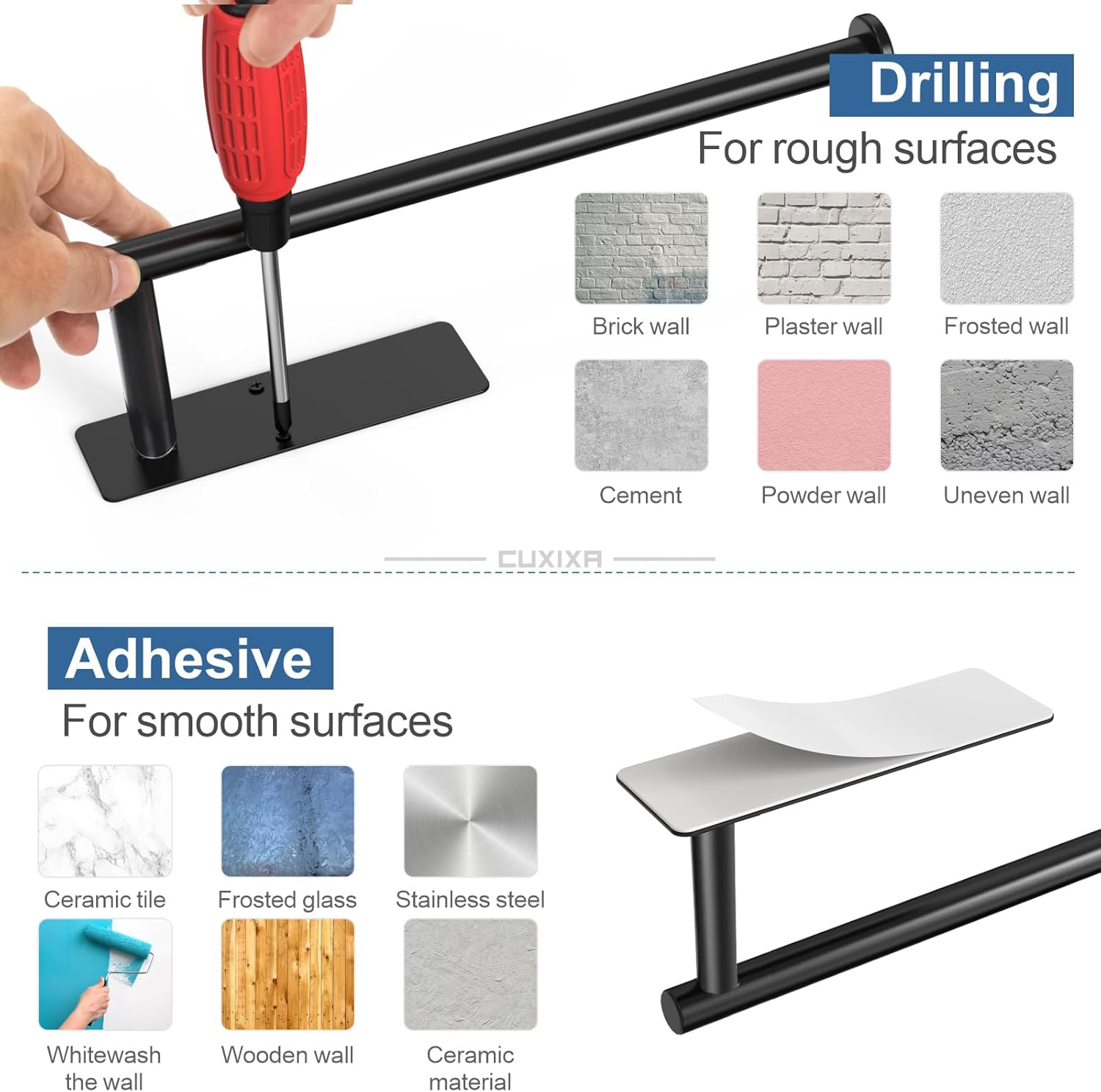 • EASY TO INSTALL: Just press it for few seconds, stick it on the smooth surface such as glass, tiles, marble, metal, wait for 24 hours to load a strong adhesion. For rough surfaces, screw mounting is recommended