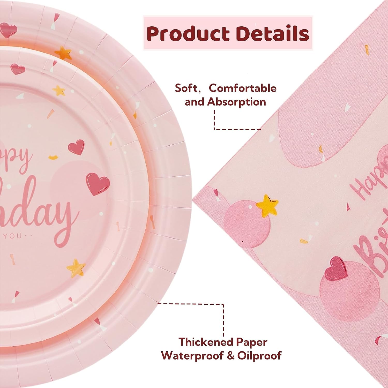 • 250 PCS HAPPY BIRTHDAY PARTY SUPPLIES: Our pink paper dinnerware set includes : 50 x 9" dinner plates, 50 x 7"dessert plates, 50 x 9oz paper cups, 50 x 6.5'' paper napkin, 50 x pink plastic forks which can serves 50 guests great for pink birthday girls theme party.
