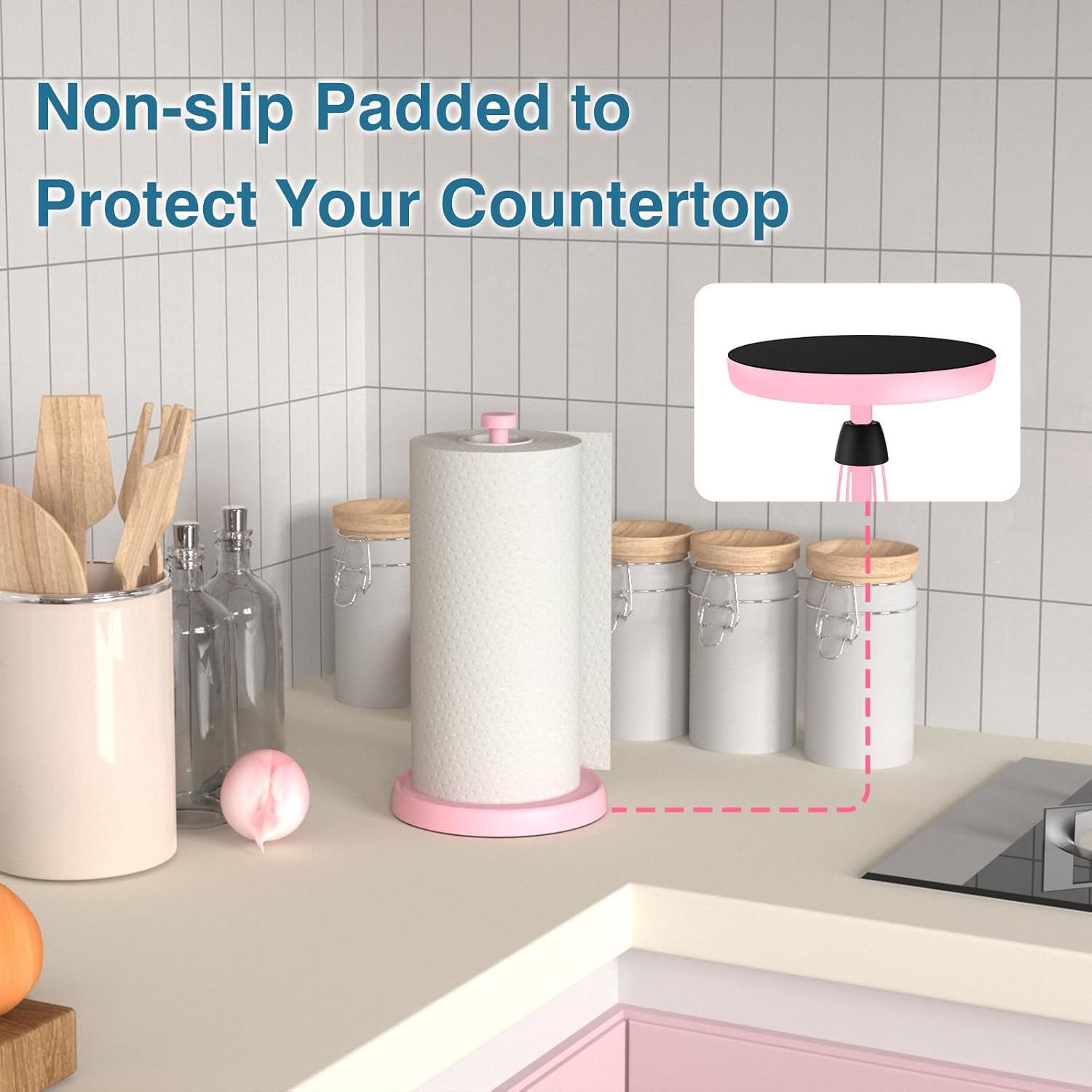• STUDY WEIGHTED BASE WITH NON-SLIP PAD:With weighted base to make sure that paper towel holder pink won't shake when you tearing the paper. Non-slip EV pad at the bottom, won't scratch your desktop. Outstanding kitchen decor and accessories!