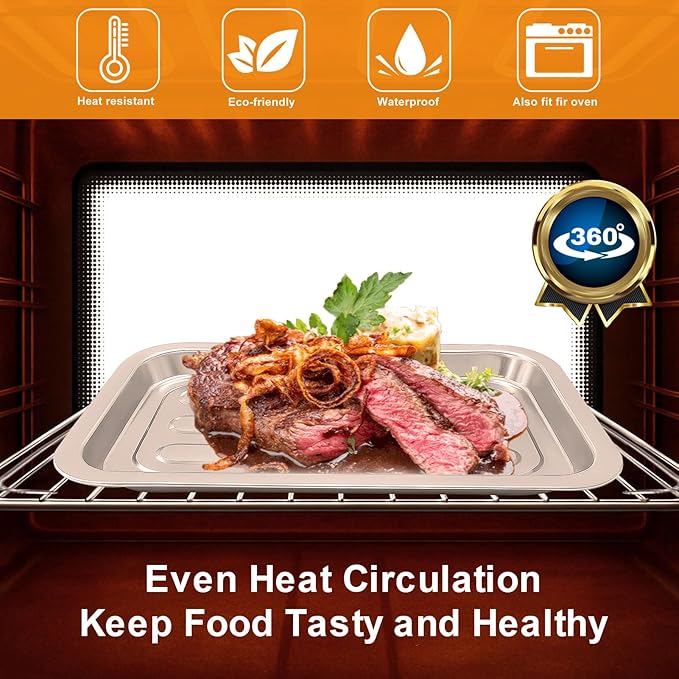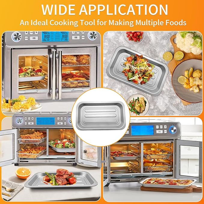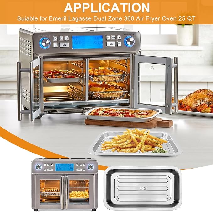 • Air Fryer Tray for Emeril Lagasse: The Air Fryer Stainless Steel Pan size is 11.5''×6.7'', Design for Emeril Lagasse Dual Zone 360 Air Fryer Oven 25 QT Combo with French Door Extra Large.