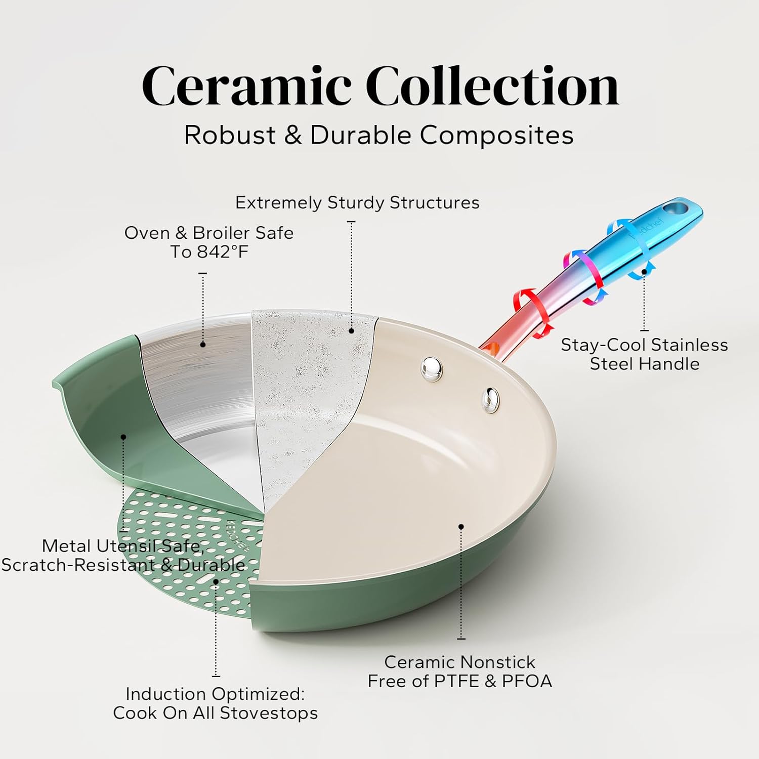 • COOL & STURDY HANDLE: Crafted from lightweight, precision-pressed stainless steel, this ergonomically designed handle ensures a comfortable grip. Double-riveted for exceptional strength and maneuverability, ceramic saute pan empowers you to seamlessly transition from stovetop to oven, allowing you to achieve that flawless sear, brown toppings, or even bake