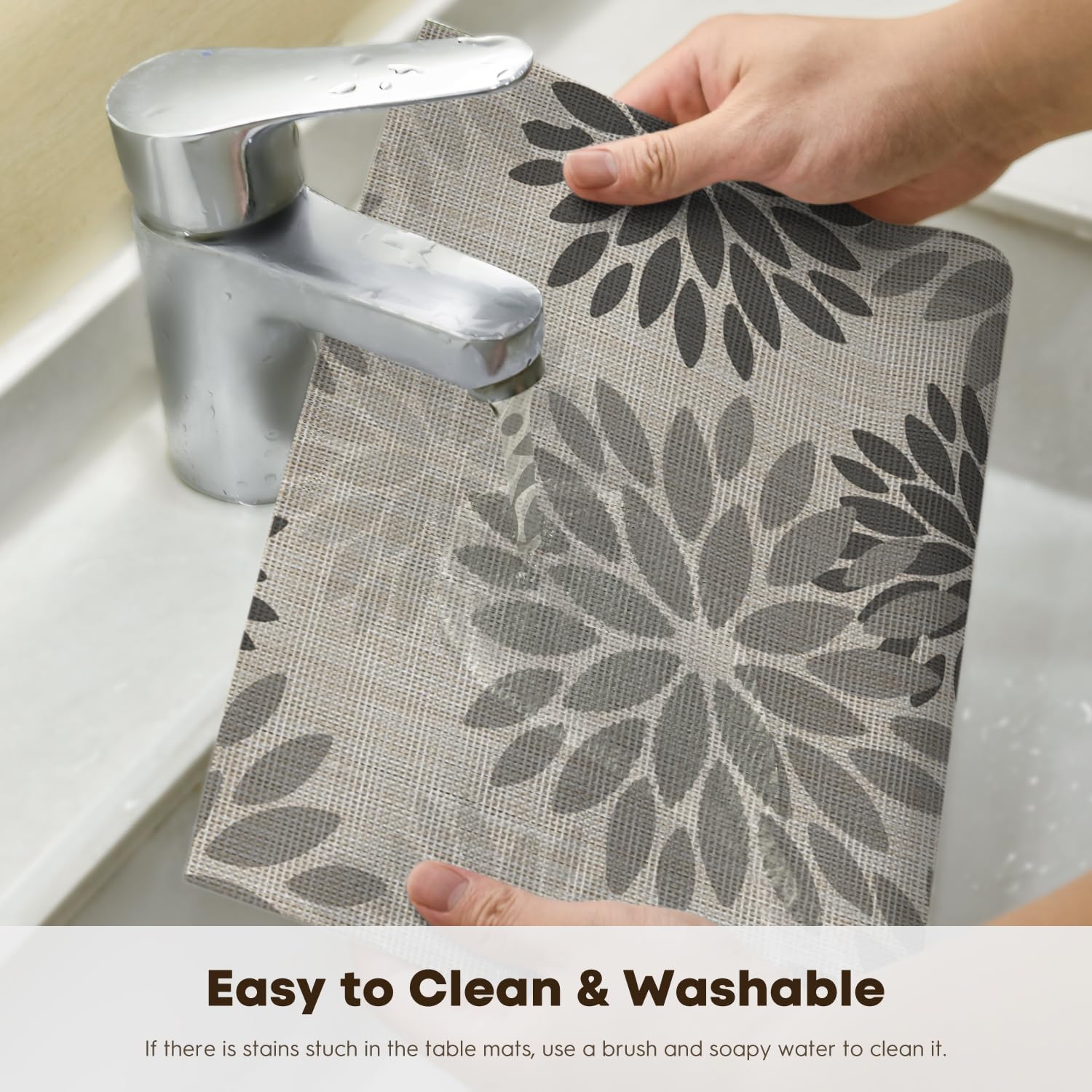 • Easy To Clean:The washable placemats simply wipe with soap,water and a soft sponge or cloth.Scrub stubborn stains with a soft bristle-brush and a bleach-based cleanse.