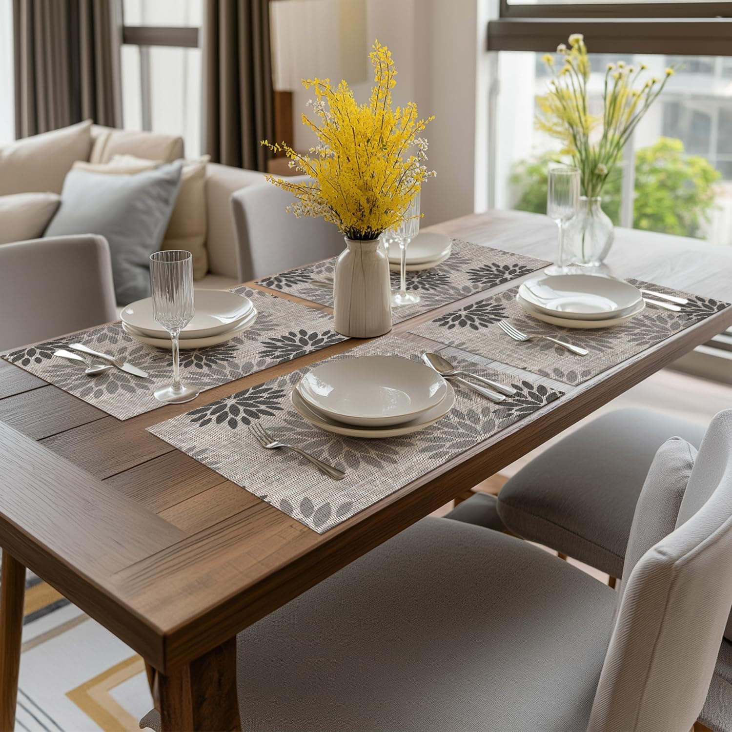 Artoid Mode Floral Vinyl Plastic Placemats Set of 4, 12x18 Inch Washable Non-Slip PVC Place Mats for Party Kitchen Dining Decor, Grey