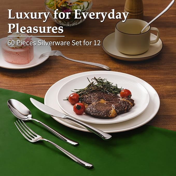 Aisoso 60-Piece High-End Silverware Set with Forks Spoons and Knives, Stainless Steel Serving Utensils for 12 with Mirror Finished Handle, Durability and Dishwasher Safe for Restaurant, Weddings