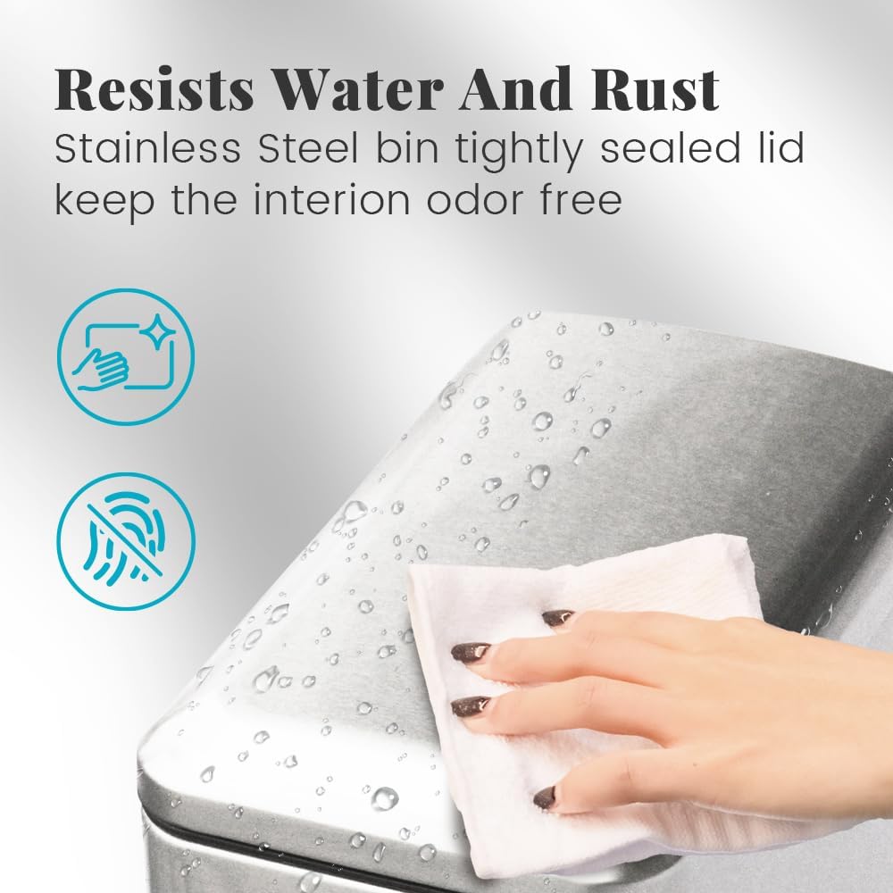 • Premium Stainless Steel Construction: Crafted from high-quality, rust-resistant, fingerprint-proof stainless steel, this sleek metal trash can is designed to withstand daily use while maintaining its elegant look.