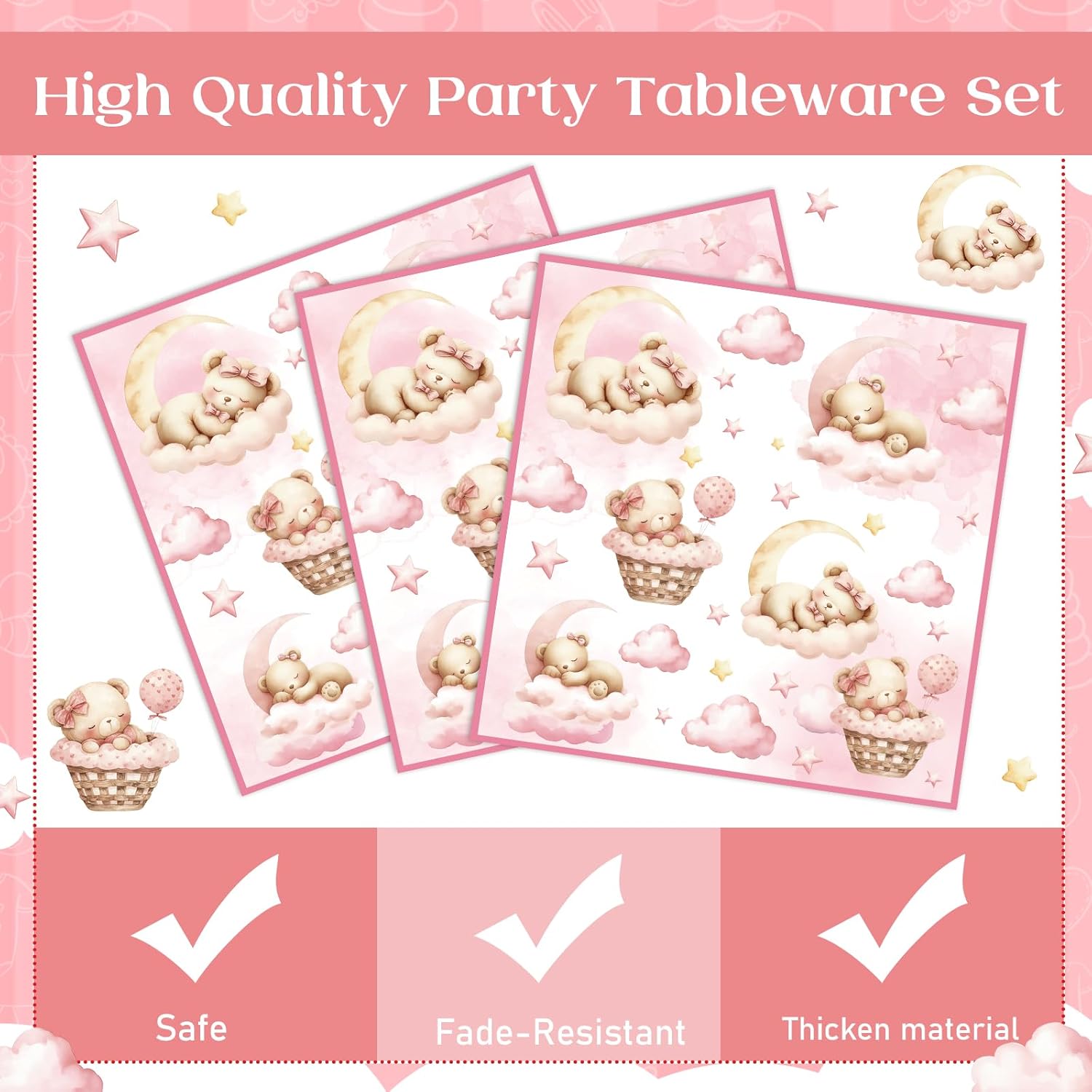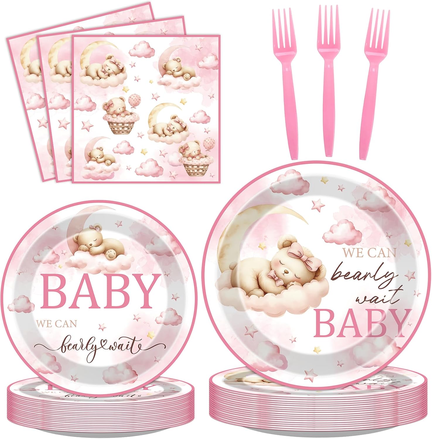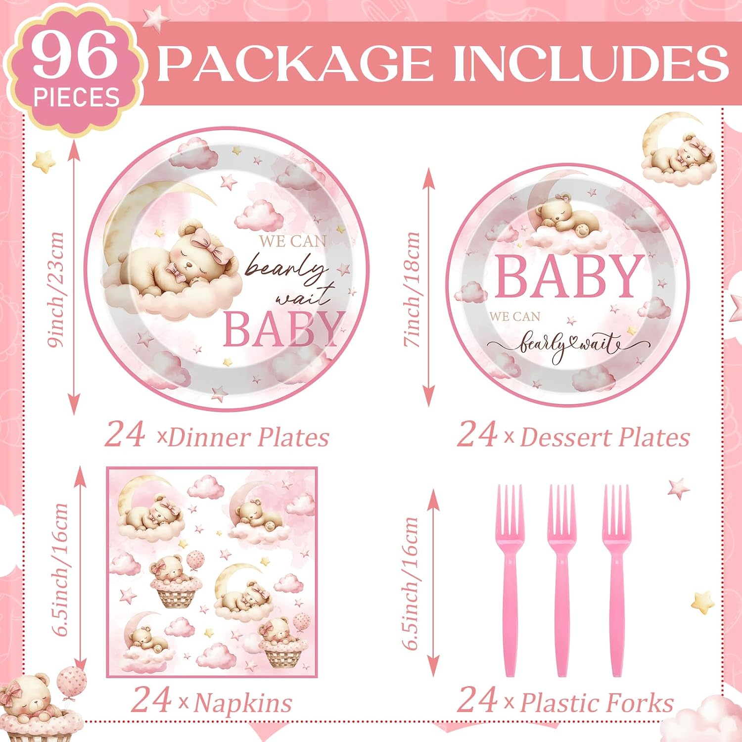 Bear Disposable Party Plates - 96 Pcs Pink We Can Bearly Wait Baby Shower Decorations for Girls Cute Gender Reveal Napkins Forks Tableware Set Supplies Shortcake Dinnerware Serves 24 Guests