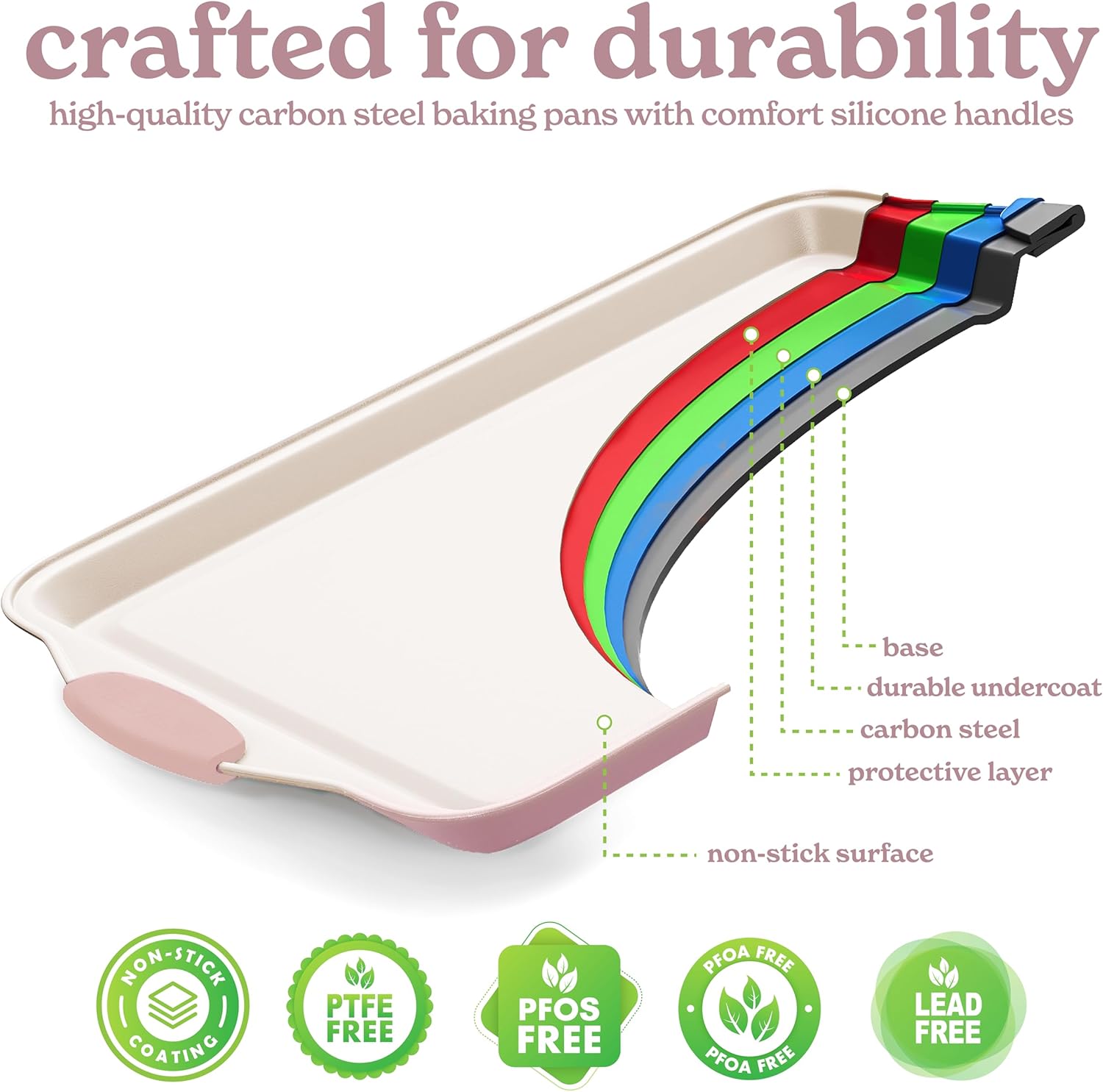 • Silicone Handles: Our bakeware sets non toxic are designed with safety in mind. The silicone handles ensure a secure grip, allowing you to easily and safely move your nonstick baking sheets in and out of the oven.