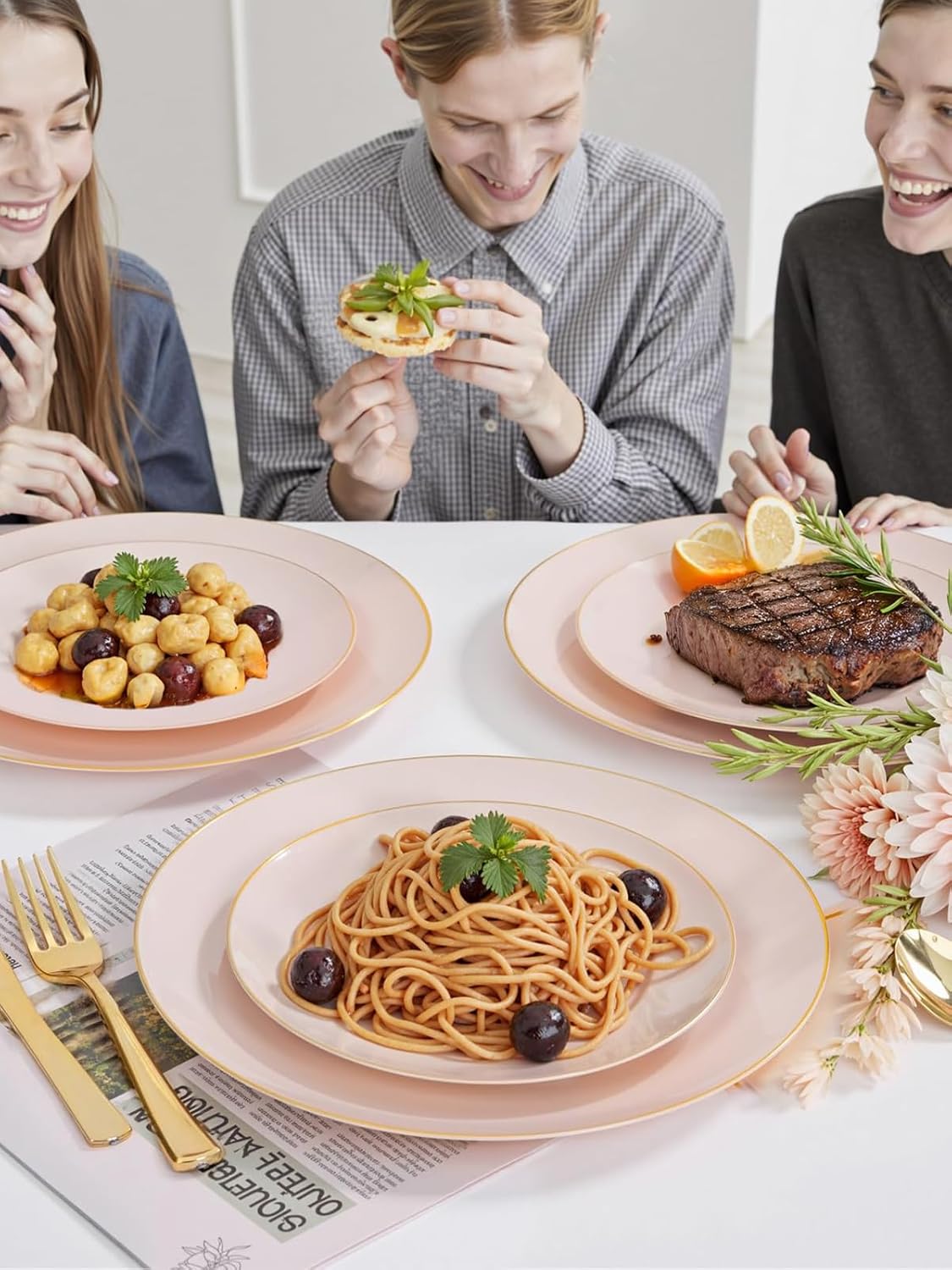 • Elegant design: Our pink plates with gold rim exude elegance, ideal for weddings, Mother's Day, romantic date nights, and glamorous occasions. The uniquely gold heavy-duty cutlery isn’t just functional—it’s a luxury statement. Visualize weddings: plates cradle delicate appetizers or stunning cakes, golden rims shimmering under soft light, as gold utensils infuse table settings with opulence.