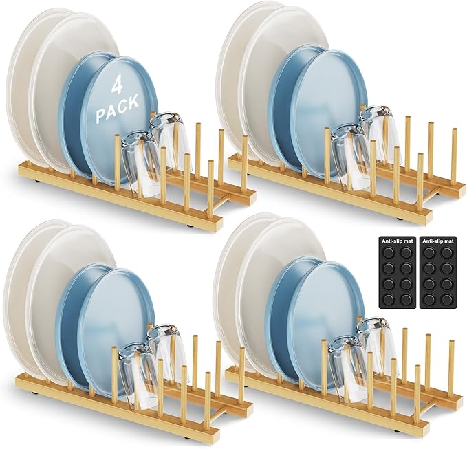 Bamboo Dish Drying Rack for Kitchen Organizer-Sturdy Plate Rack Organizer with Natural Bamboo, Dish Rack Holds Plates, Cups & Cutting Boards-Dish Drying Rack for Countertop & Cabinets(4 Pack)