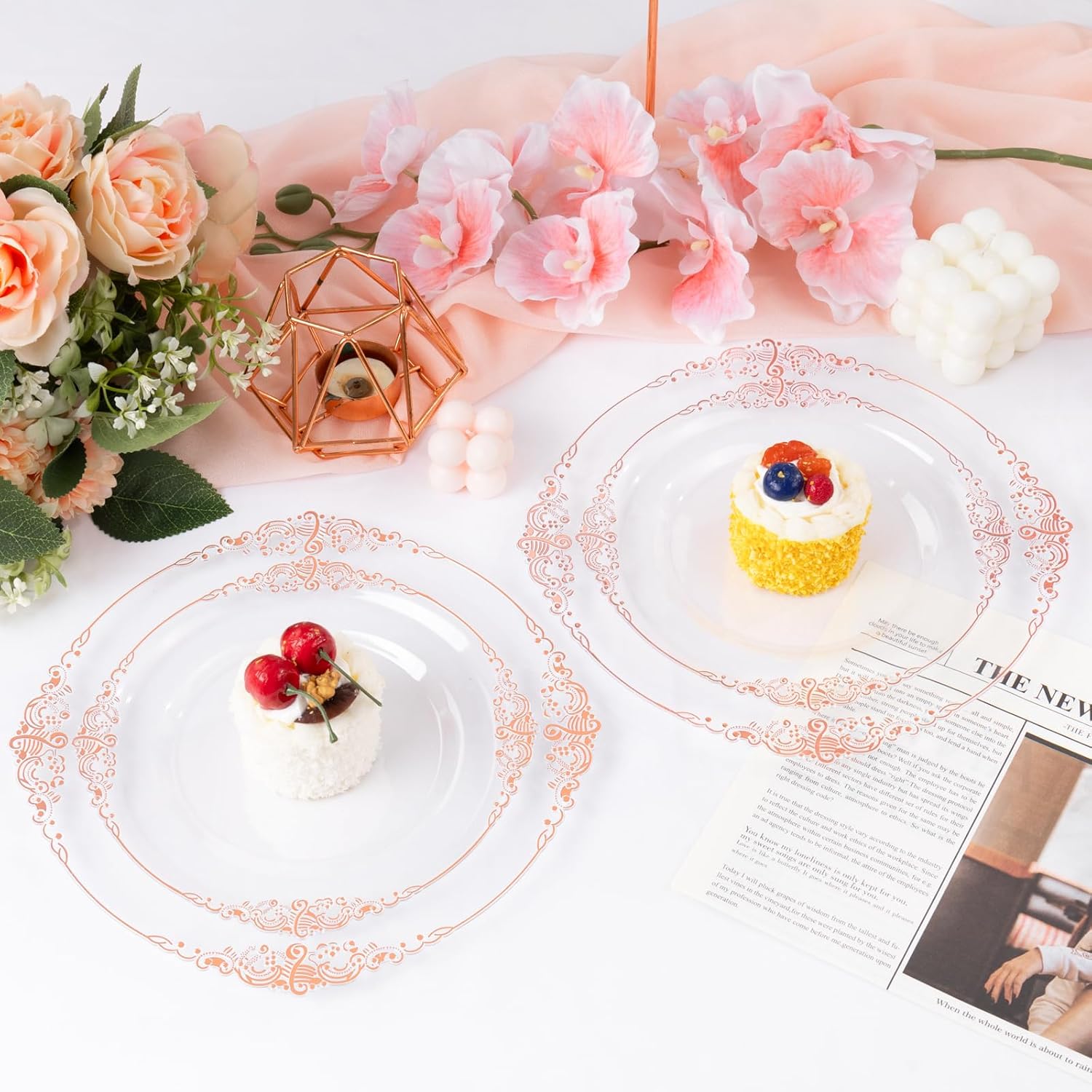 102PCS Rose Gold Plastic Plates - Clear Rose Gold Plate - Heavy Duty Disposable Plates - Fancy Disposable Dinner & Dessert Plate for 51 Guests for Party & Wedding