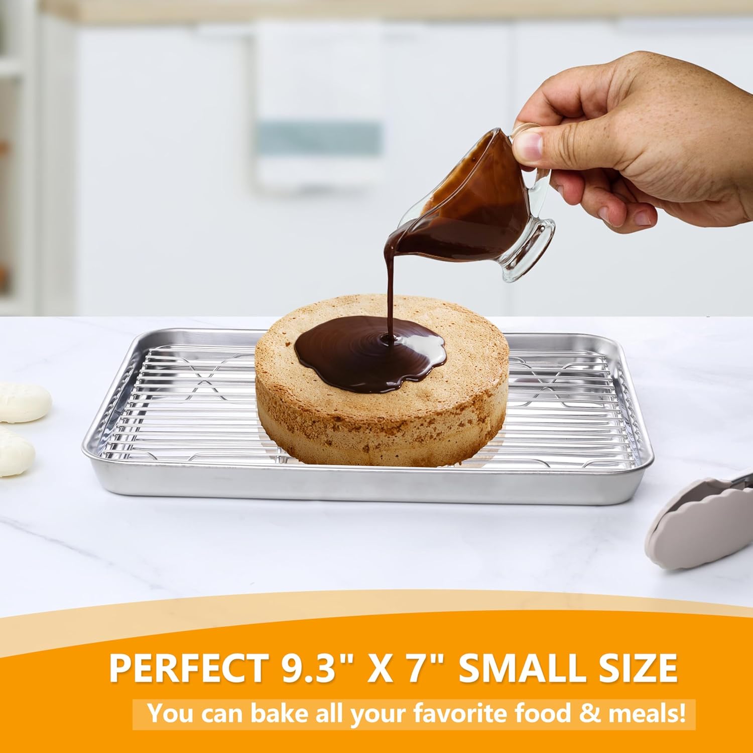 • Premium material, 9" x 7" baking sheet pan with rack is made of stainless steel without any chemical coating, free of rust and corrosion, safe to oven and perfect for roasting cooking cooling, durable for home kitchen restaurant usage, a great replacement of aluminum or ceramic ones
