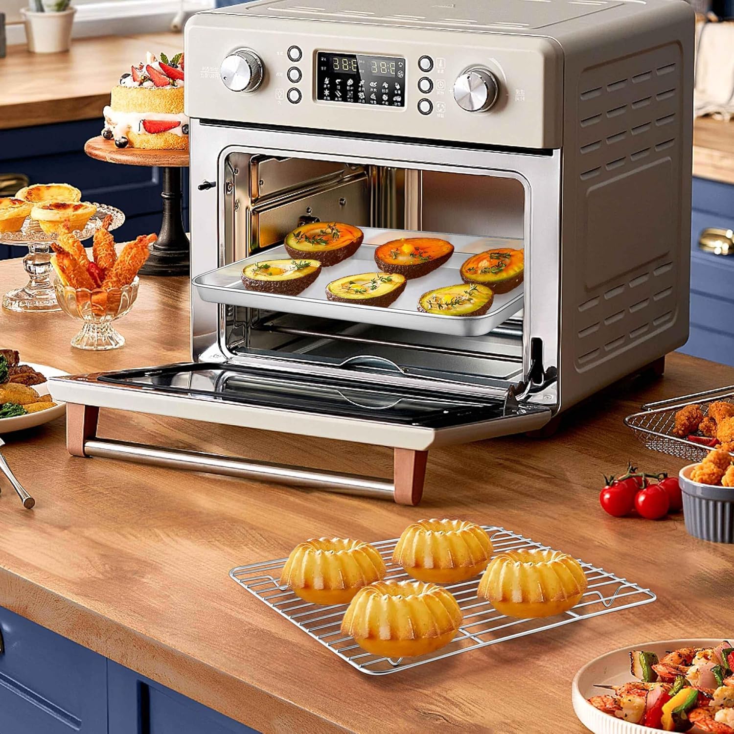 • Baking tray, nonstick bakeware set includes 1 cookie sheet pan 9.3" x 7" x 1" and 1 cooking rack 8.7" x 6.3", work perfectly together or shine in their respective fields, fits the most common oven, toaster oven and air fryer, big and deep to meet sweet or savory baking, ideal for toasting dinner as chicken, steak, serving vegetable, cookies and meats, make you enjoy your cooking baking journey