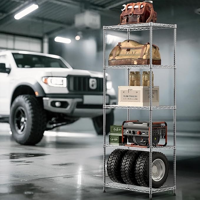 • 【Strong & Durable with 1250 lbs Capacity】 Built with chrome-plated carbon steel and reinforced posts, this 5-tier wire rack holds up to 1000 lbs. Ideal for storing kitchen appliances, heavy tools, or pantry bins.
