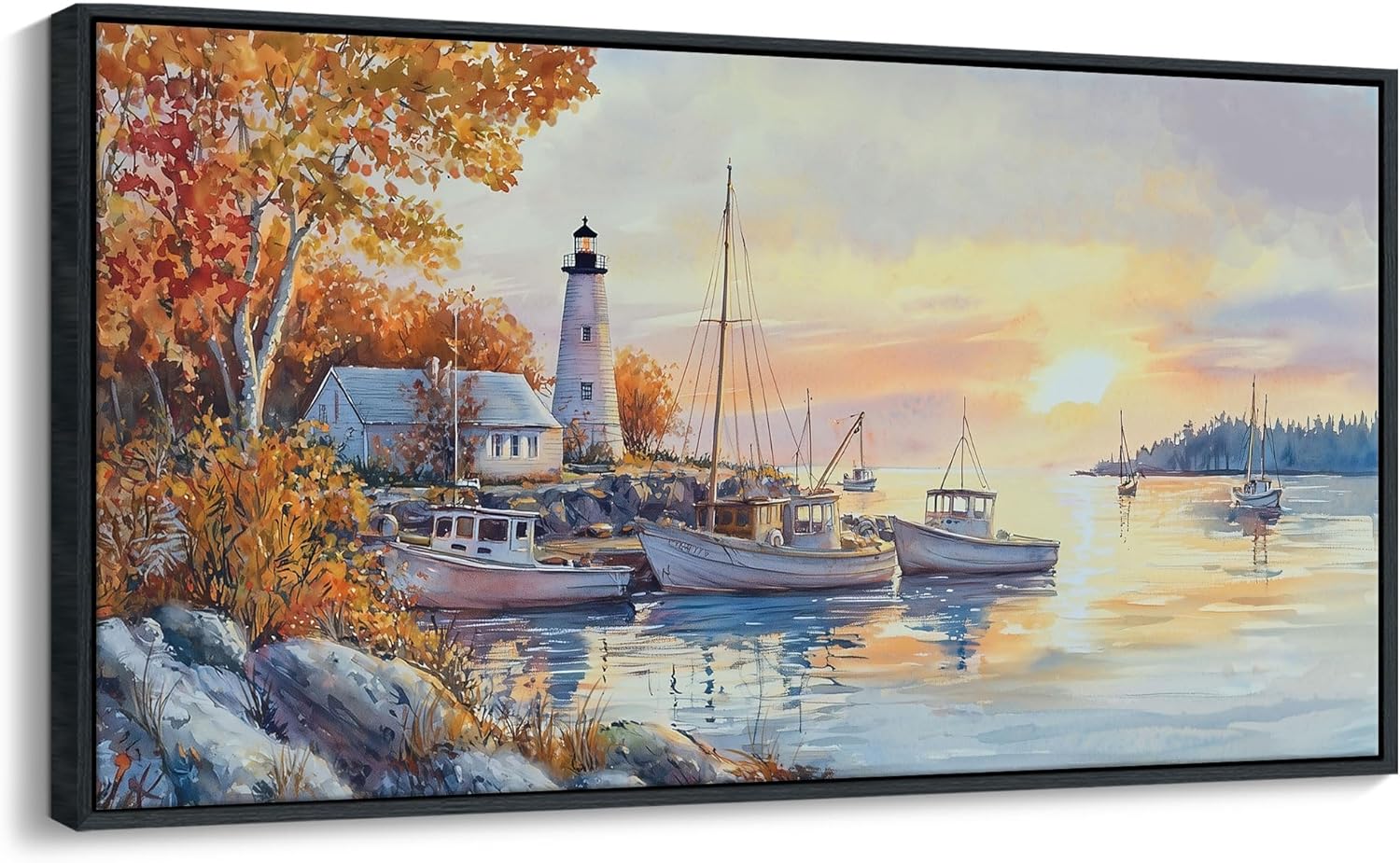 QZQCBLC Harbor Landscape Wall Art, Sunset Over the Sea Homeward-bound Boat Pictures Artwork Large Modern Lighthouse Ocean View Painting Framed for Living room Bedroom kitchen Home Office Decor 24x48 IN