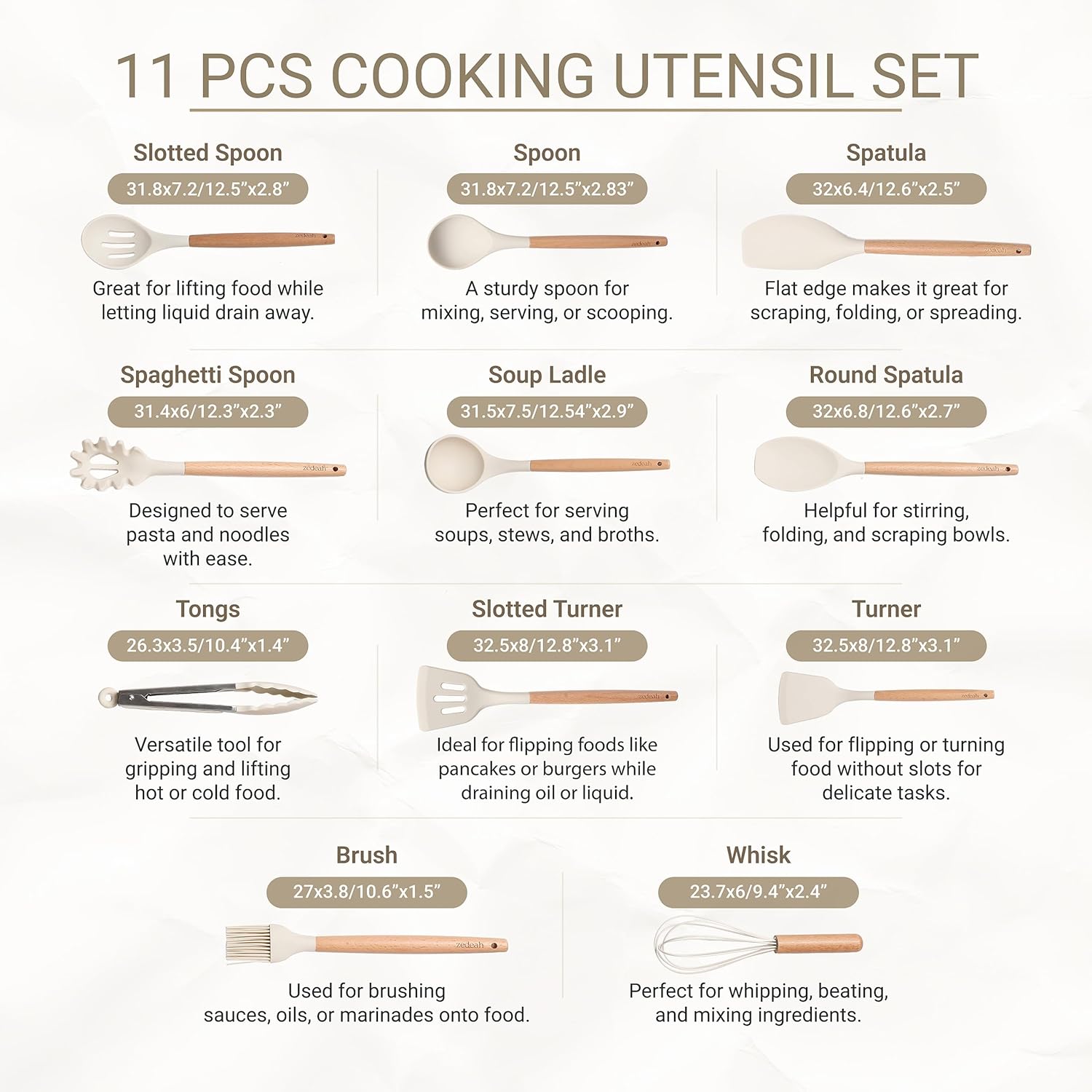 11-Piece Silicone Kitchen Utensil Set with Spatulas, Tongs, Whisk, Turner & Ladle – Heat Resistant, Non-Scratch Cooking Tools with Wooden Handles, Dishwasher Safe, BPA-Free (Beige)