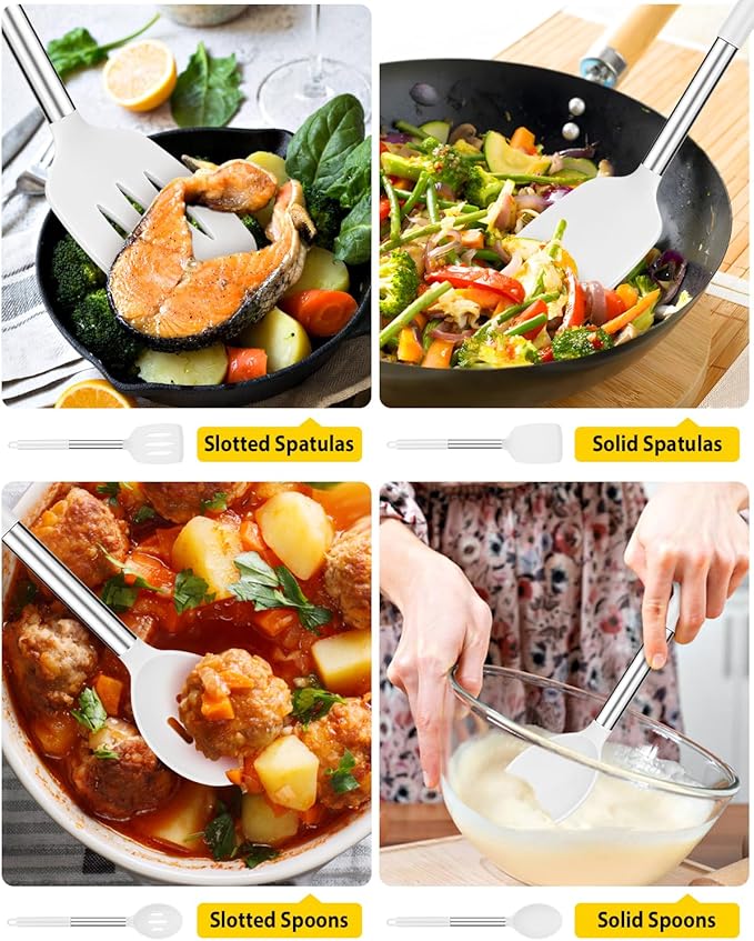 • Thoughtful Design : The good-quality 18/8 stainless steel keeps you away from the trouble of kitchen utensils rusting or breaking; This anti-scald silicone handle is not easy to conduct heat and is more comfortable to hold than traditional utensils