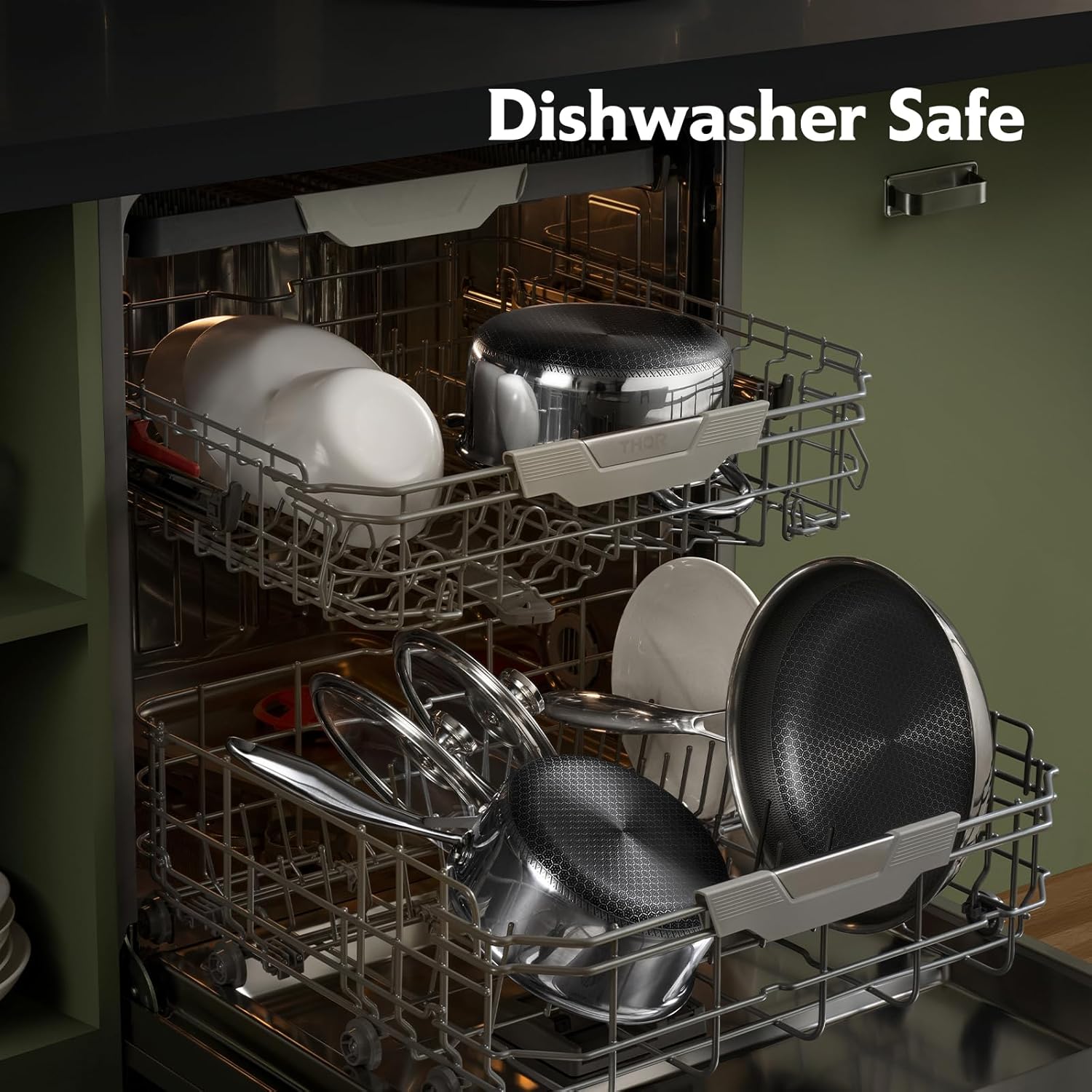 • 【Effortless Cleaning】The honeycomb-patterned coating on these pots and pans prevents food from sticking and enables quick cleaning - whether by hand or in any standard dishwasher