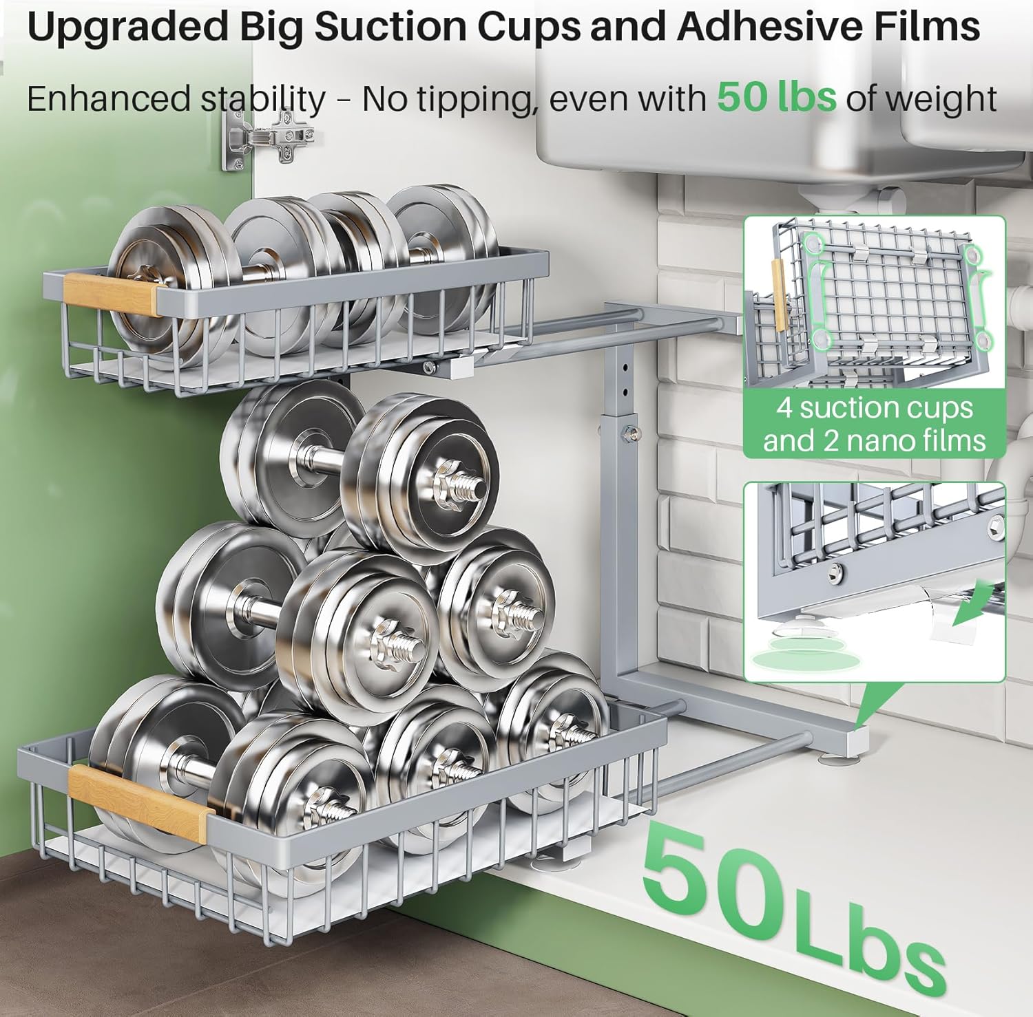 • Advanced Stability for Heavy Loads: With 4 large suction cups and 2 nano adhesive films, this under sink organizers and storage system provides exceptional stability, holding up to 50 lbs effortlessly. Its smooth pull-out design ensures no wobbling, making it the perfect kitchen sink organizer for secure and easy access.