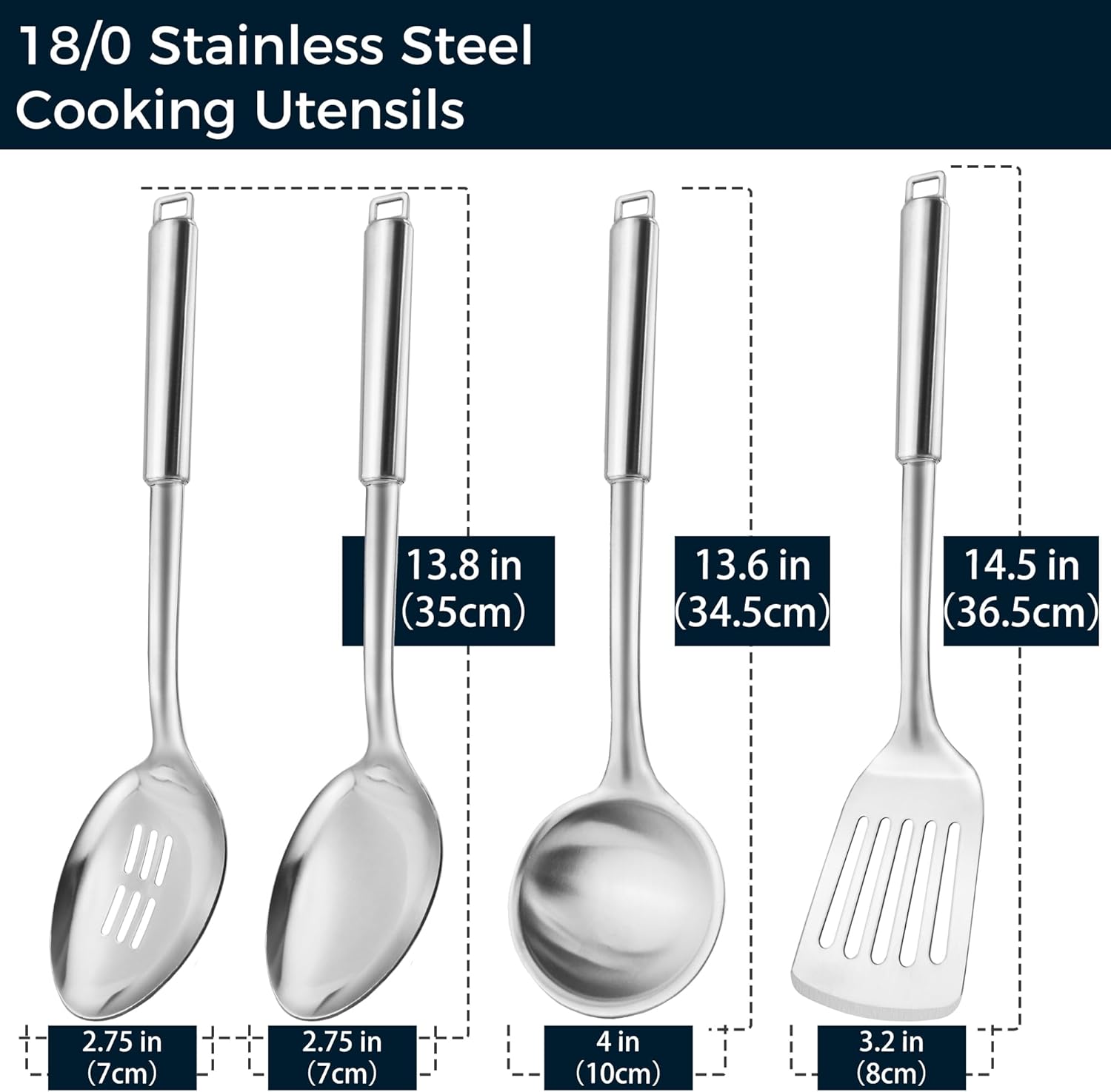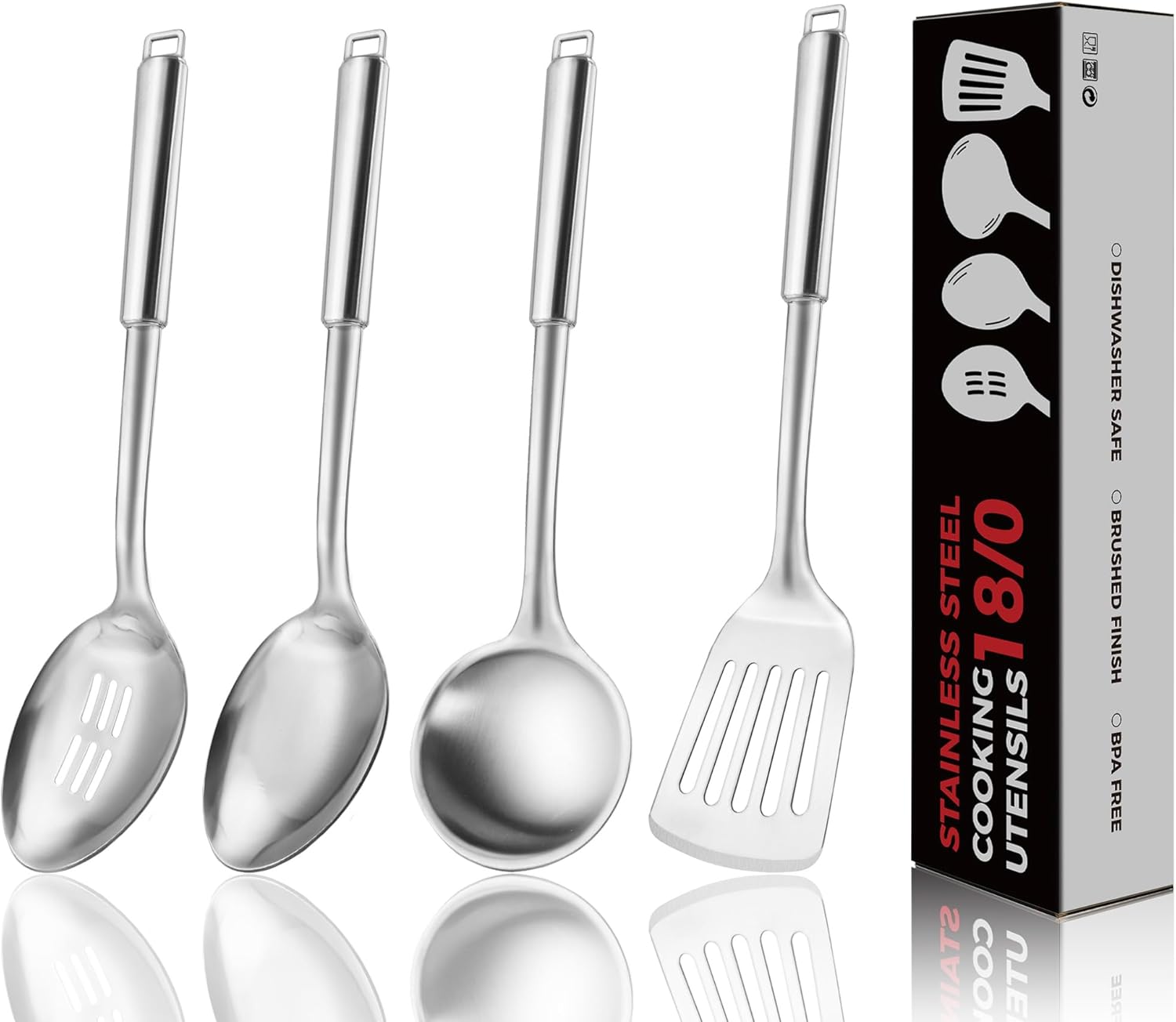 18/0 Stainless Steel Kitchen Cooking Utensil Set, Ergonomic Handle, Dishwasher Safe, Slotted Spoon, Ladle, Turner, Serving Spoon for Housewarming Daily Use Commercial, Pack of 4