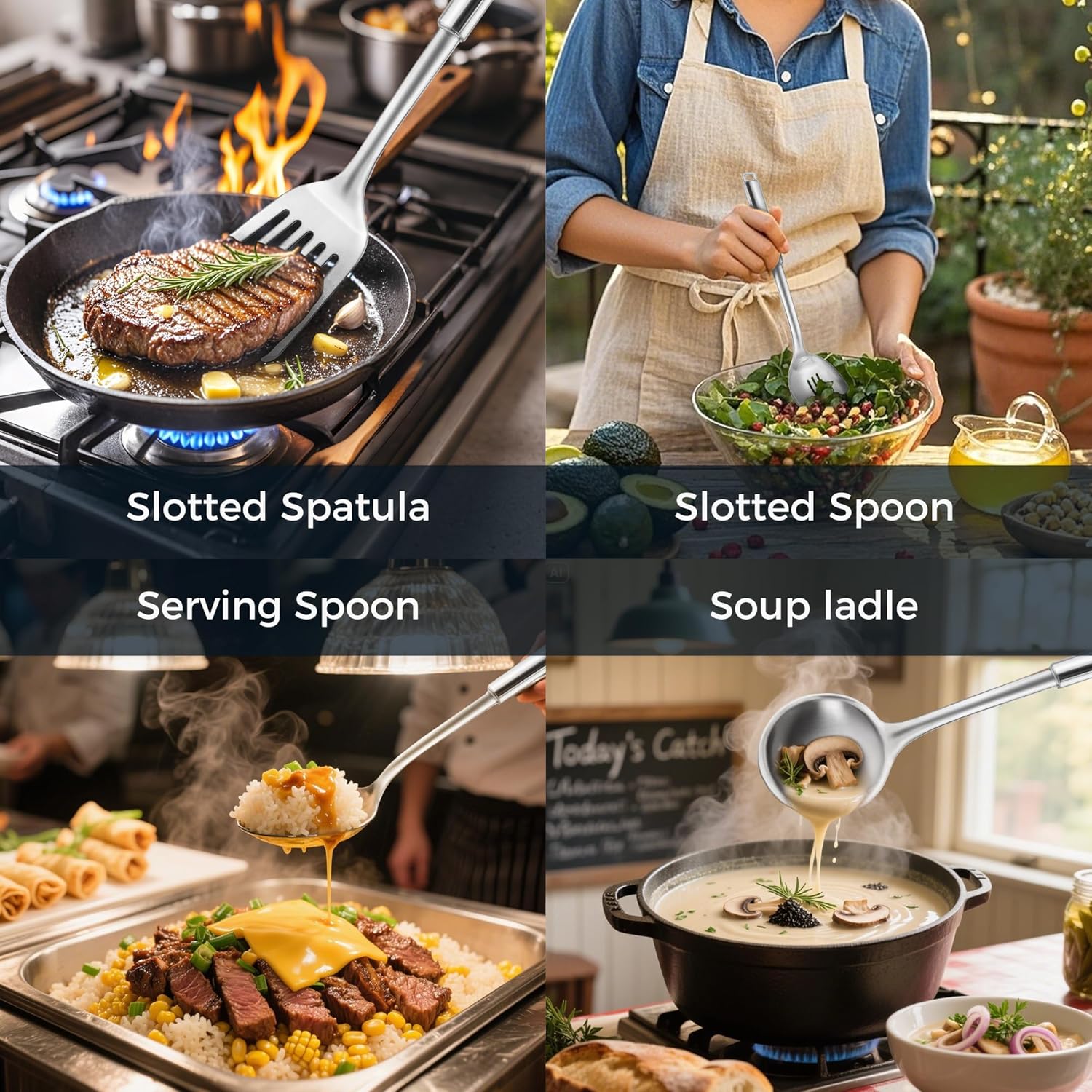 • Versatile 4-piece set - This kitchen utensils set includes slotted spoon, serving spoon, solid ladle and spatula. They cover all needs from cooking to serving with elegant functionality: frying, stirring, mixing, basting, banquet, wedding, buffet, potluck and so on.