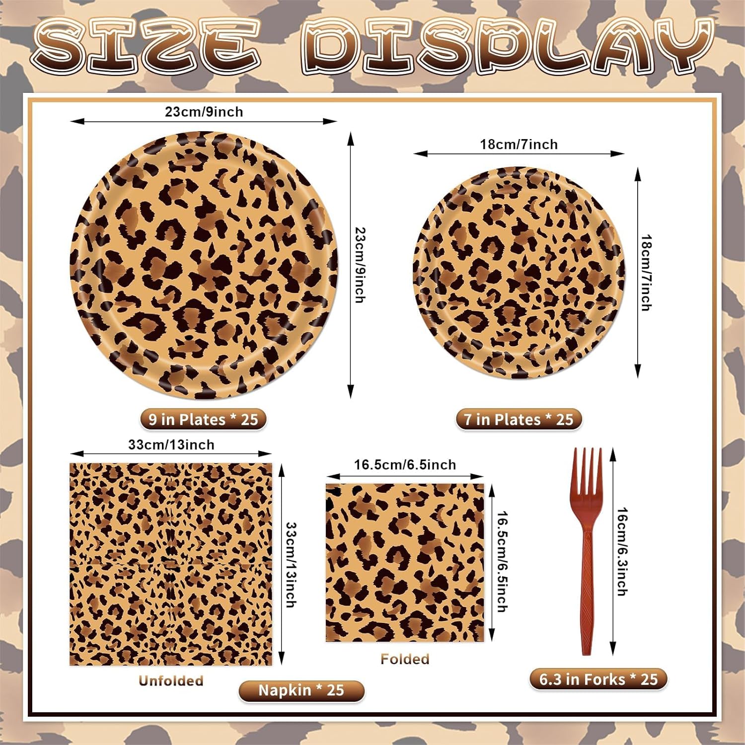 100 Pcs Leopard Print Tableware Party Supplies - Disposable Animal Print Dinnerware Set with Paper Plates, Napkins and Utensils for Safari Theme, Jungle Birthday - Serves 25