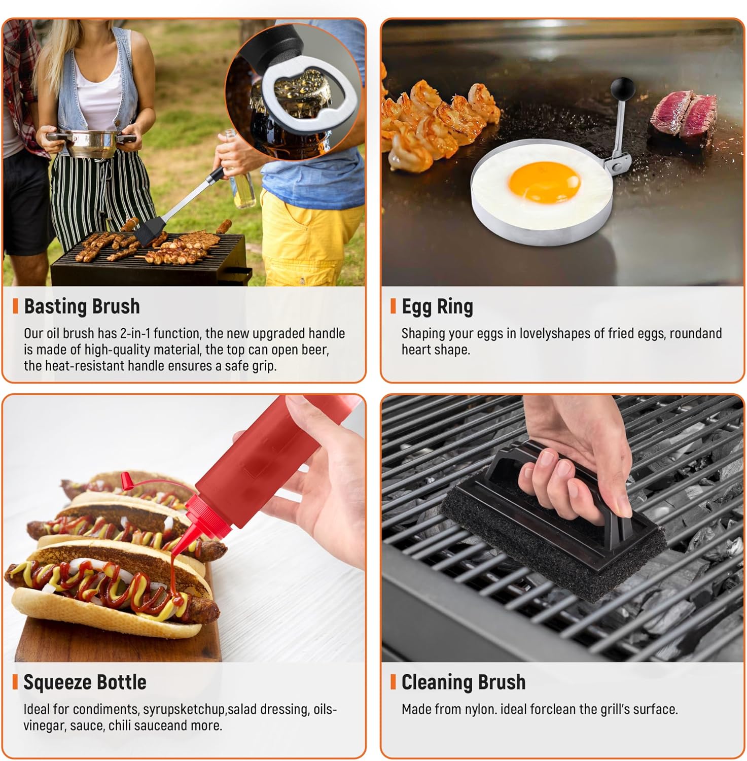 • 🍢【12 Pieces Grill Accessories】: Our flat top grill accessories include 2 oversized grill spatulas, perfect for flipping beef cubes, omelettes, rice, noodles, and vegetables. The set also includes 1 chopper for dicing food, 1 grill tongs, 1 hamburger spatula, 1 basting brush, 1 cleaning brush, 2 egg fryers, 2 squeeze bottles, 1*Portable Bag with Gift Box.