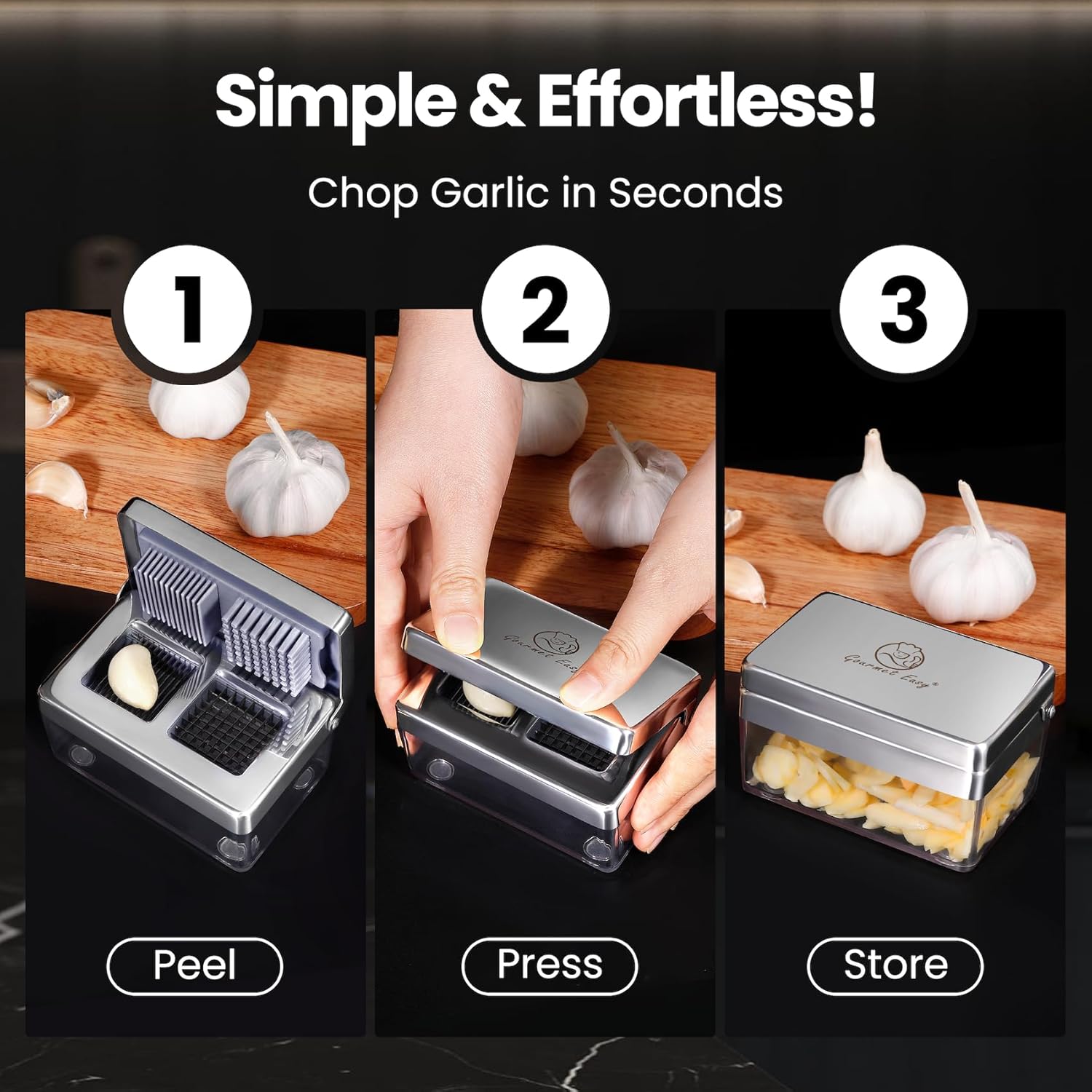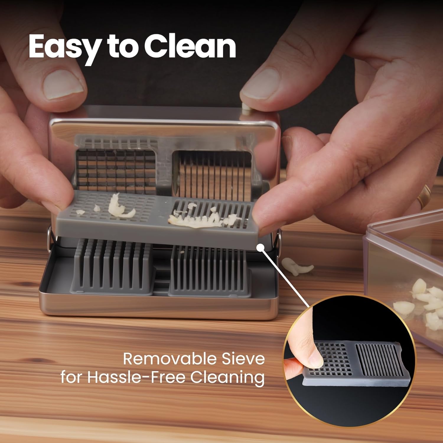 Garlic Press Stainless Steel, Garlic Chopper Mini & Slicer Super Thin 2 in 1, Odor Free Ginger Dicer With Storage Container, Dishwasher Safe Mini Chopper, Premium Mincer with 5 year warranty