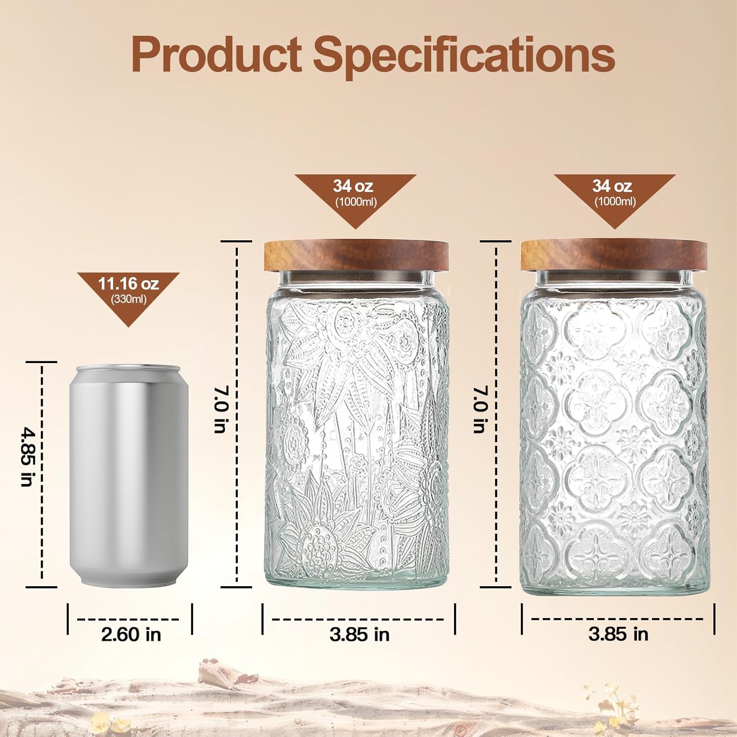 2-Pack 34 OZ Vintage Glass Jar with Lid, Airtight Food Storage Canisters with Bamboo for Kitchen Counter Pantry, Ideal for Coffee, Candy, Tea, Oats, Sugar, Cookies Decorative Jars