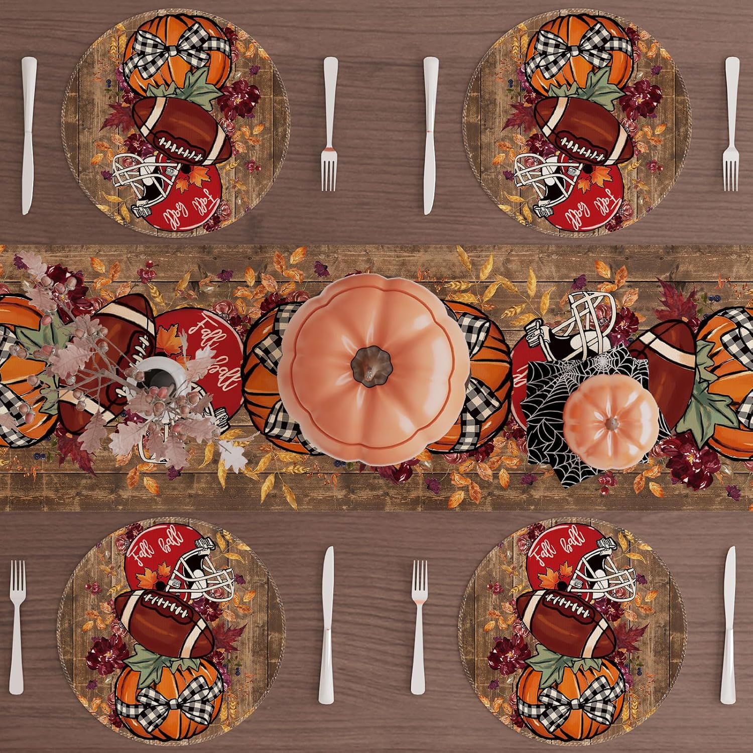 XCHI Fall Football Pumpkin Wood Round Placemats Set of 4 Table Mats for Party Home Kitchen Dining Table Decorations 14x14 Inch