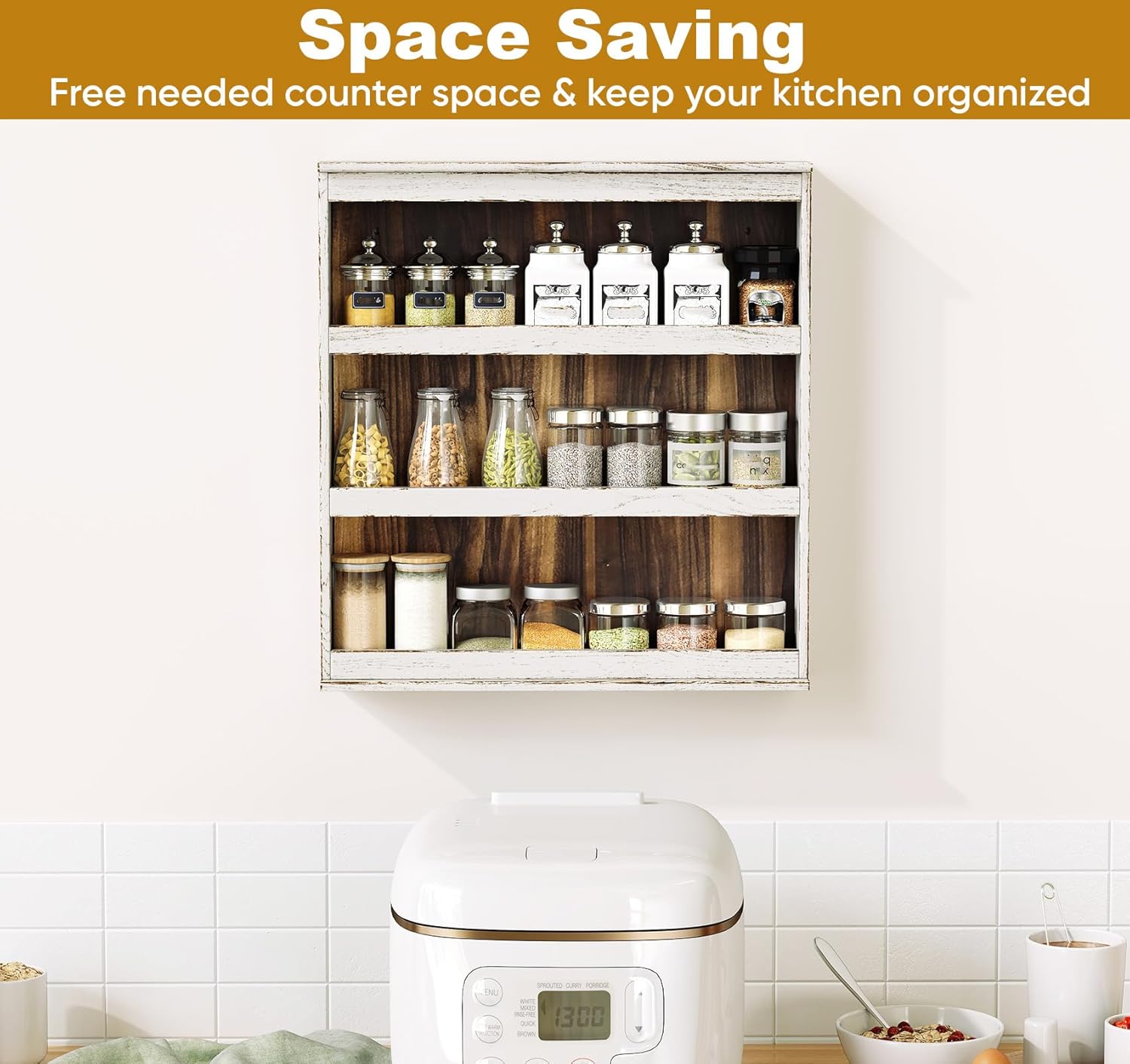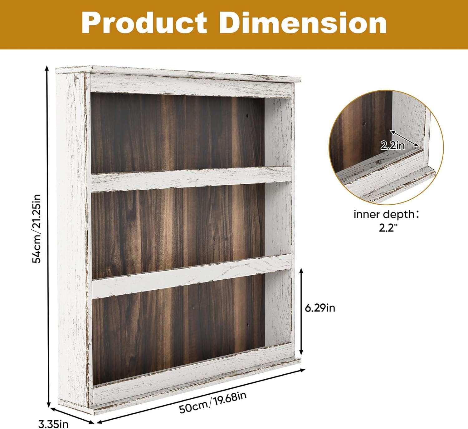 • READY-TO-DISPLAY VINTAGE STYLE: The wall mount spice rack arrives with a genuine rustic finish – carbonized wood grain and artfully chipped white borders – adding instant, charming farmhouse elegance to your culinary space. Revamp your kitchen today