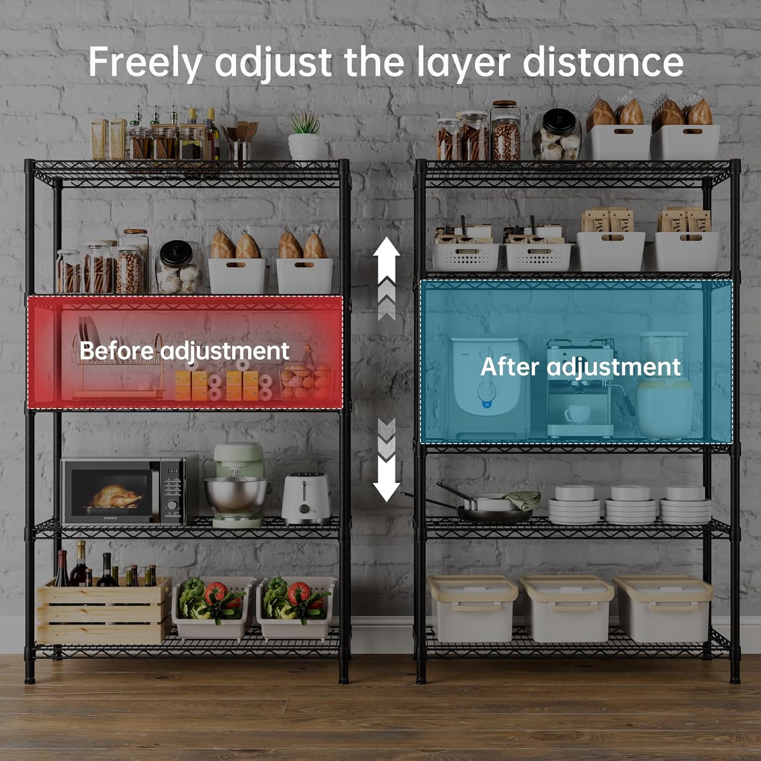 • Convenient Home Storage: Metal wire shelves with adjustable spacing make perfect for narrow spaces or room corners such as kitchens, bathrooms, laundry rooms, balconies, garages, entries, or offices.