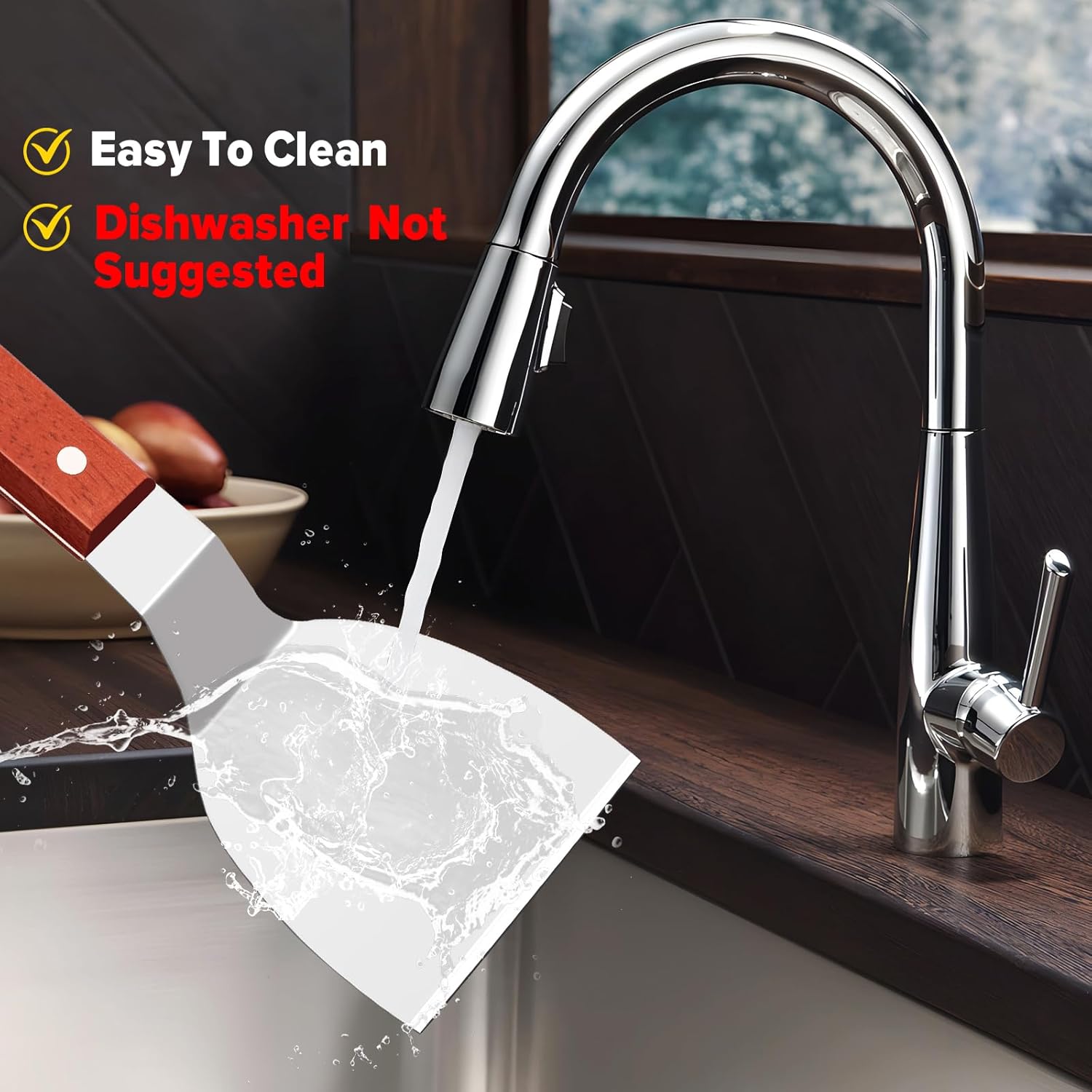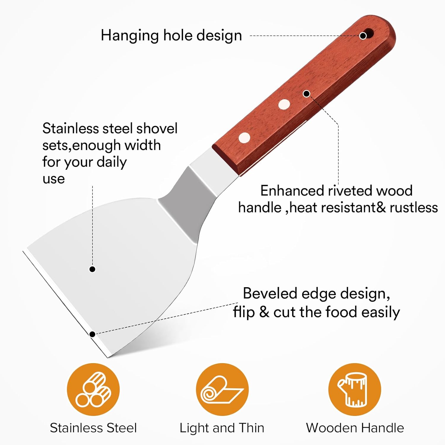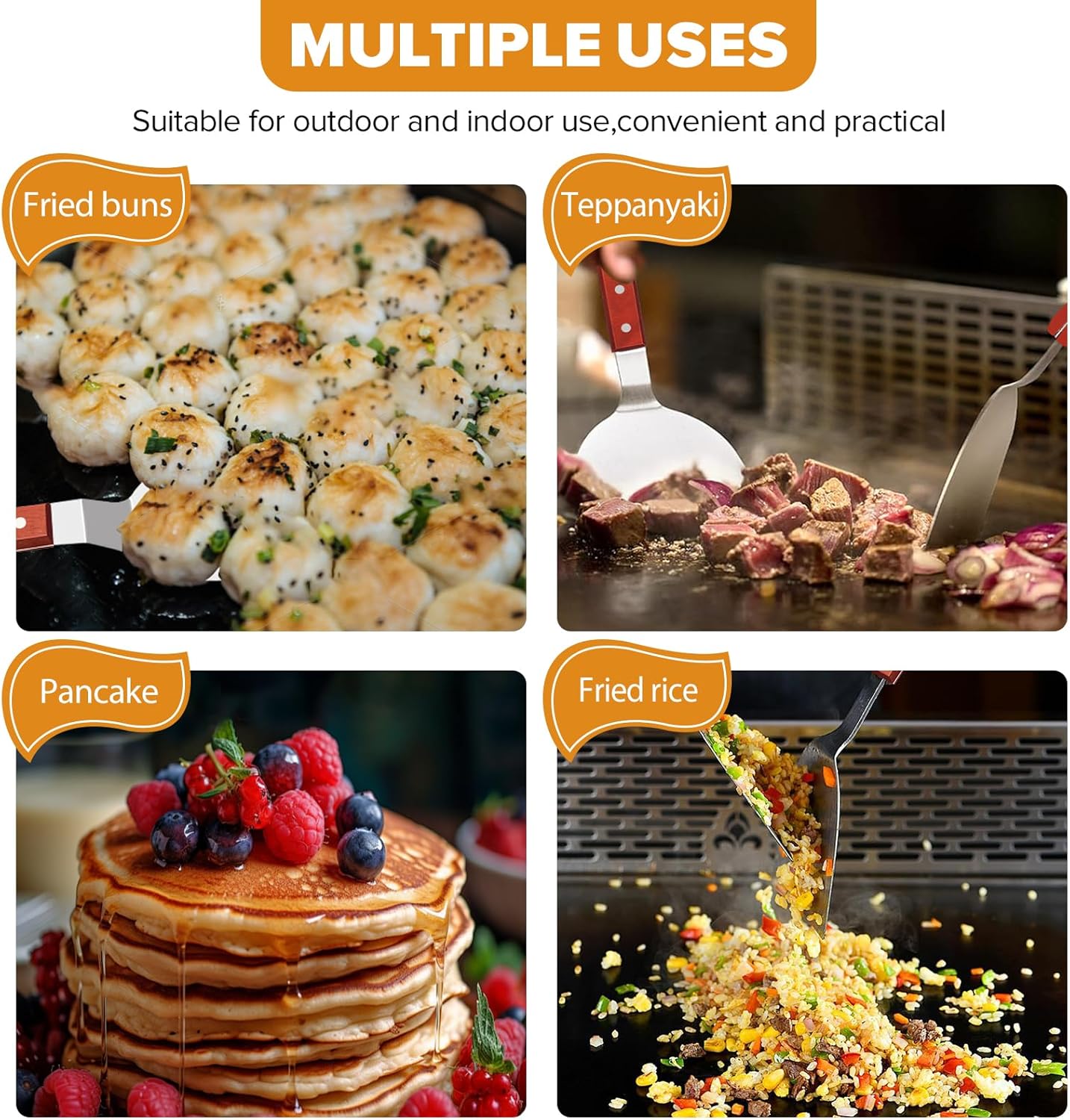 • Premium Material: Our griddle spatulas are made of high-quality stainless steel,heat resistant, ergonomic and durable.The riveted wooden handle is natural,no rustic,anti-slip,non-toxic and healthy,making it safe to use in the kitchen and outdoors,works great for large crowds like Banquets and gatherings.
