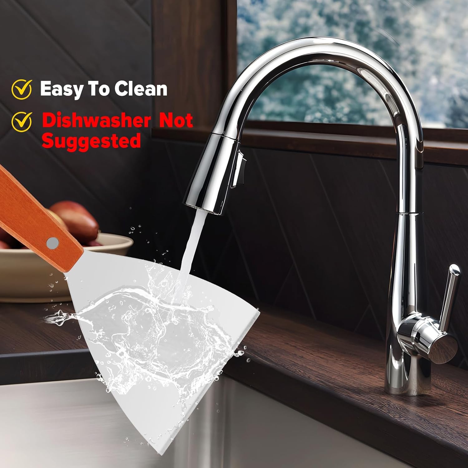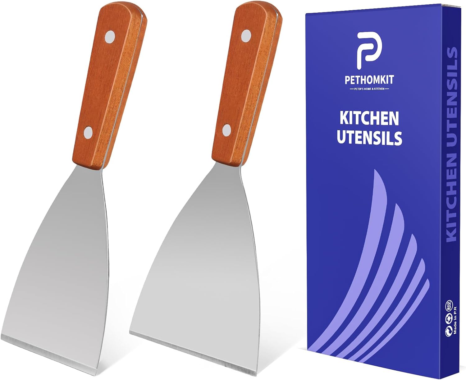 • Ergonomic Design: Professional Small kitchen metal scraper sets.All grill/griddle scrapers blades has strong and thin slanted cutting edge to easily slip under food for flipping or scraping during cooking baking and serving(not so fit for left-handed people).The wooden handle with 2 rivets add strength and provides a comfortable grip and insulation from heat, making it extra sturdy and durable