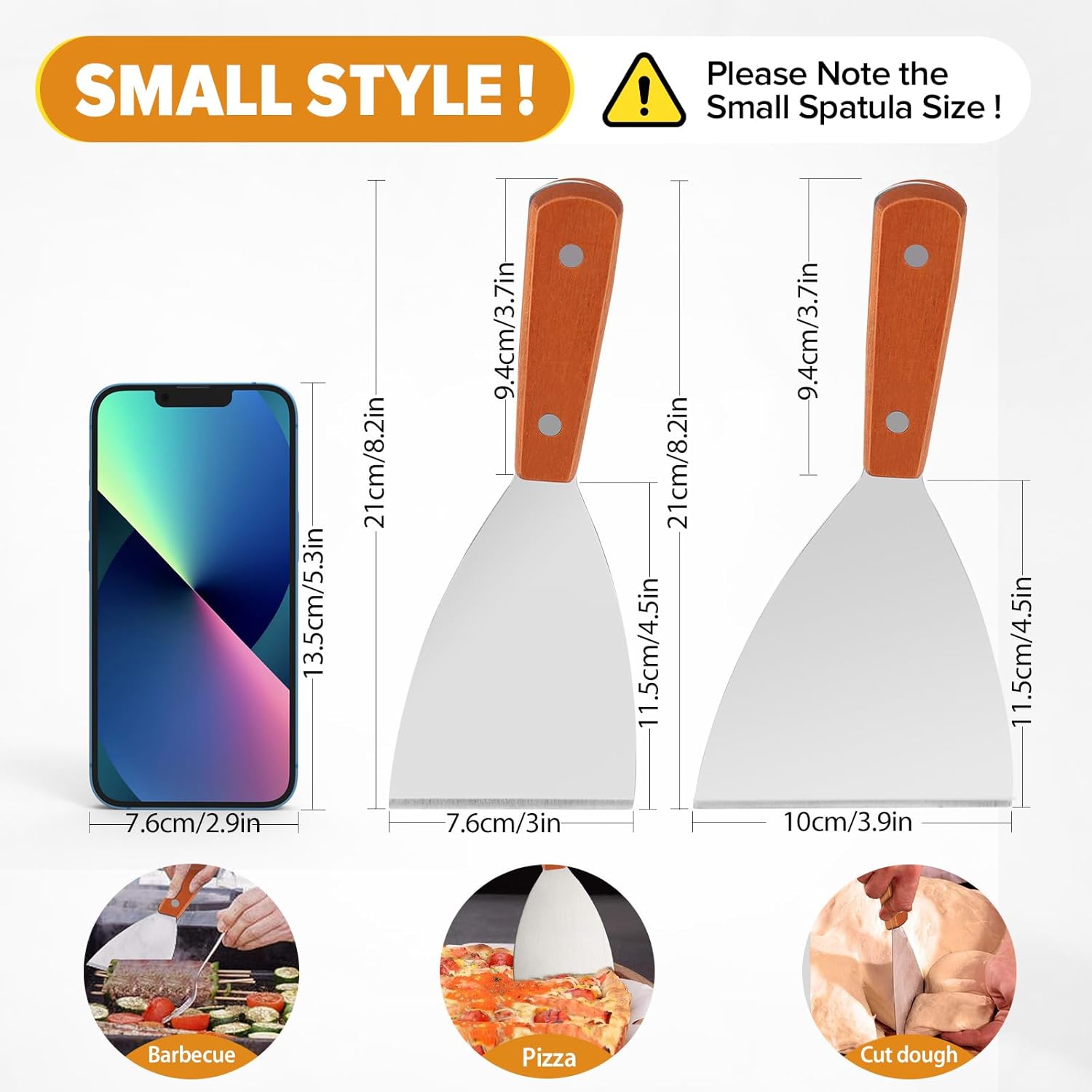 • Package Include: 2 packs of small flat metal spatula scraper set inside for home kitchen use,including 1 mini grill scraper of 8" x 3" and 1 small bowl scraper of 8" X 4", great for cutting lifting serving and cleaning foods.Perfect size for dough pancake pizza teppanyaki BBQ and burgers.