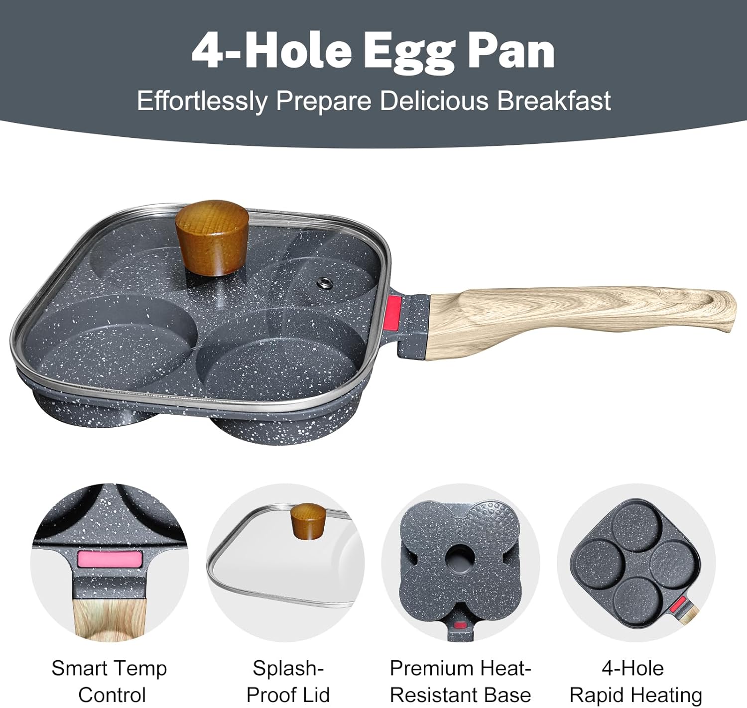 • 【Upgraded 4-Cup Design – Egg Pans Nonstick】 Our egg pan features a convenient four-hole design with an advanced nonstick coating, allowing you to simultaneously cook four eggs, bacon, burgers, pancakes, or other favorites. Saving you time and effort on busy mornings with faster, more efficient cooking