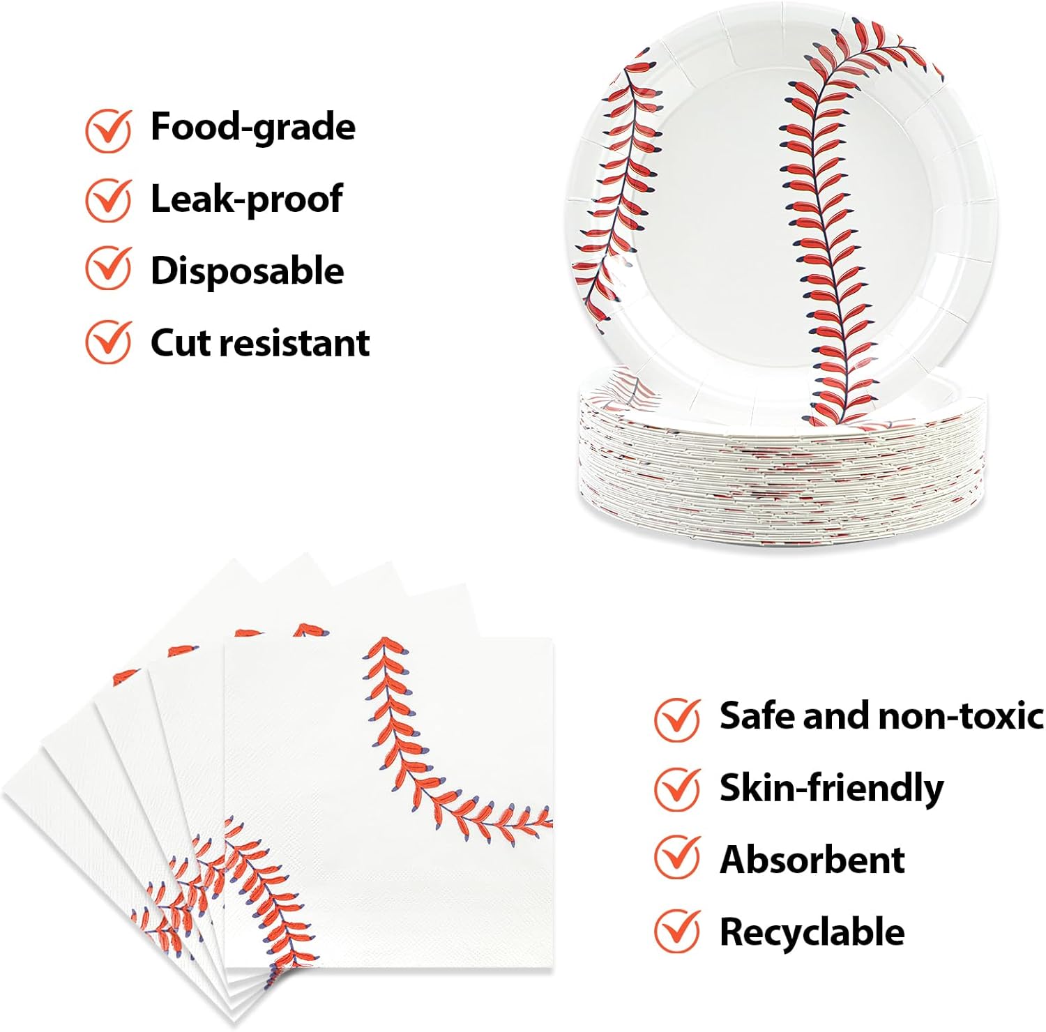 • 【CHIC BASEBALL DESIGN】With classic red and white baseball patterns, our baseball plates and napkins is both attractive and elegant. The entire surface of the plate is a full baseball pattern, so when you pick up a plate, it's like picking up a baseball! Make your baseball themed party more fun and memorable by adding a sense of ambiance to your party and gathering.