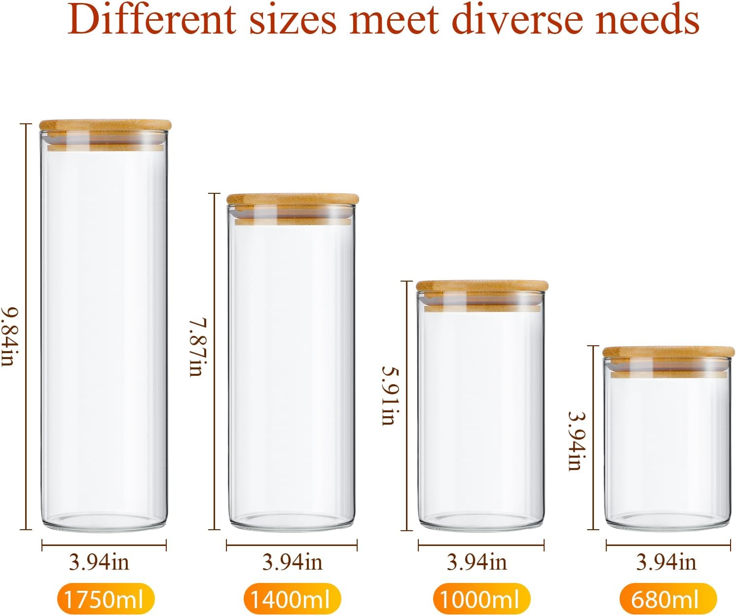• Wide Range of Application Scenarios: the glass jars with bamboo lids can be applied to collect nuts, flour, candies, grains, cookies, teas and other small things; Their clear shape makes it easy to access items, and your kitchen will be cleaner with these storage glass jars