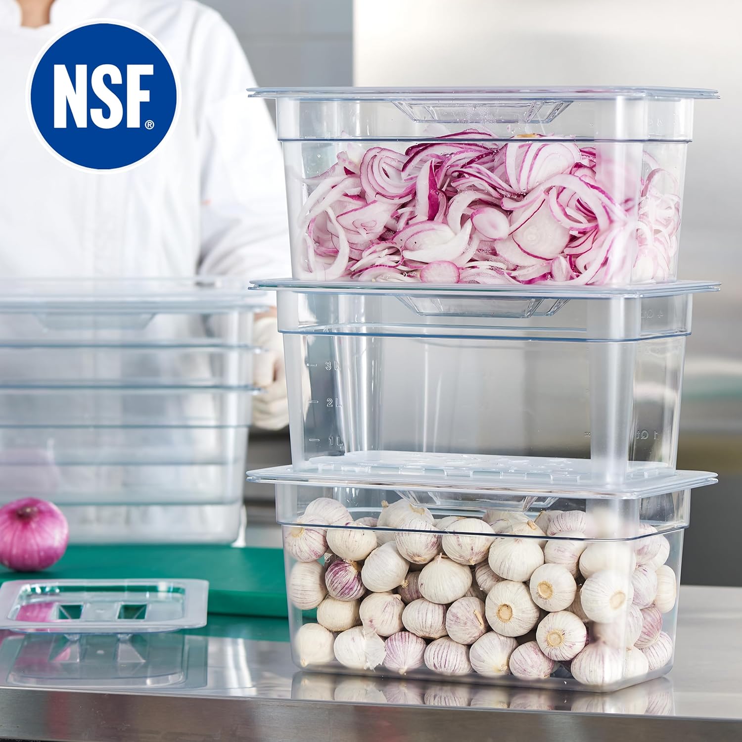 • 6" Deep Design with Spoonable Corners to Reduce Waste - The 6-inch depth and 5.59 qt. capacity make these pans versatile for prepping, storing, and serving. Spoonable interior corners allow for easy content removal, reducing waste and improving efficiency. Reinforced and textured edges resist bending and cracking, ideal for heavy-duty, long-term use.