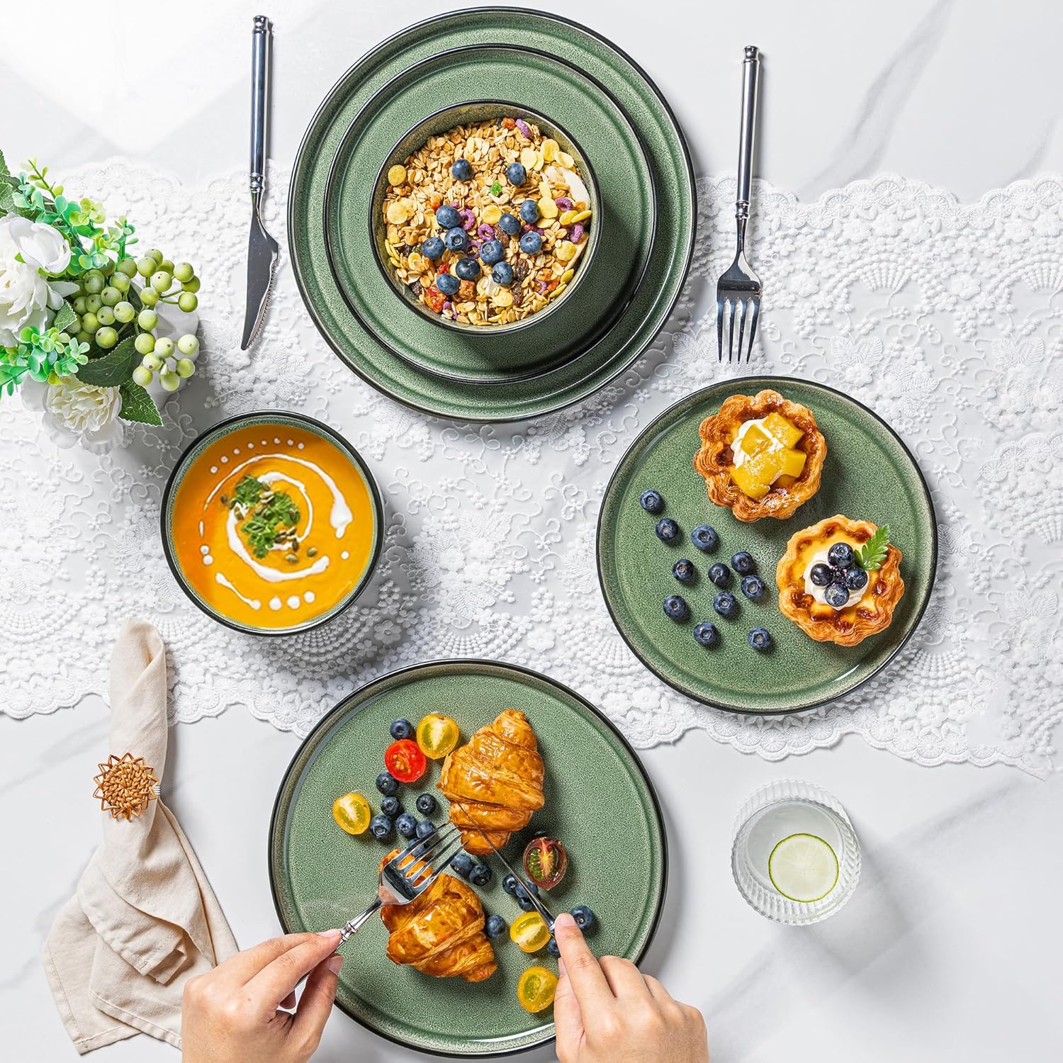 • EVERY PLATE IS UNIQUE: This dinerware set are fired with two different glazes, so the surface develops a beautiful color and makes your food looked even more delicious. The reactive glaze makes every plate unique. Since our glaze is all-natural, it tends to change color depending on the lighting. The color may be a tad different from what you see on your screen, but every item is beautiful.