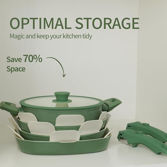 23pcs Ceramic Pots and Pans Set, Nonstick Detachable Handle Cookware, Induction Kitchen Cooking Set with Removable Handle,include Frying Pans & Saucepans Oven Safe(Green)