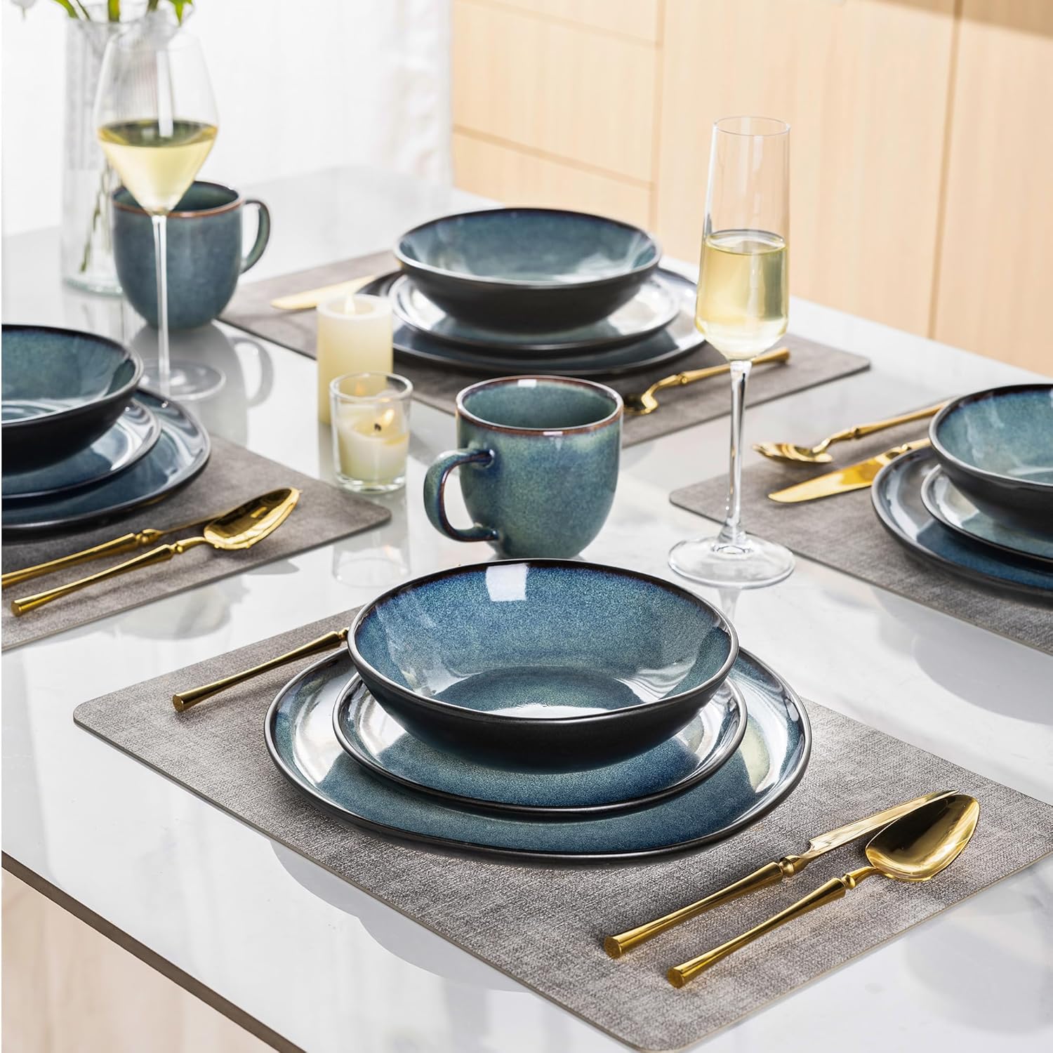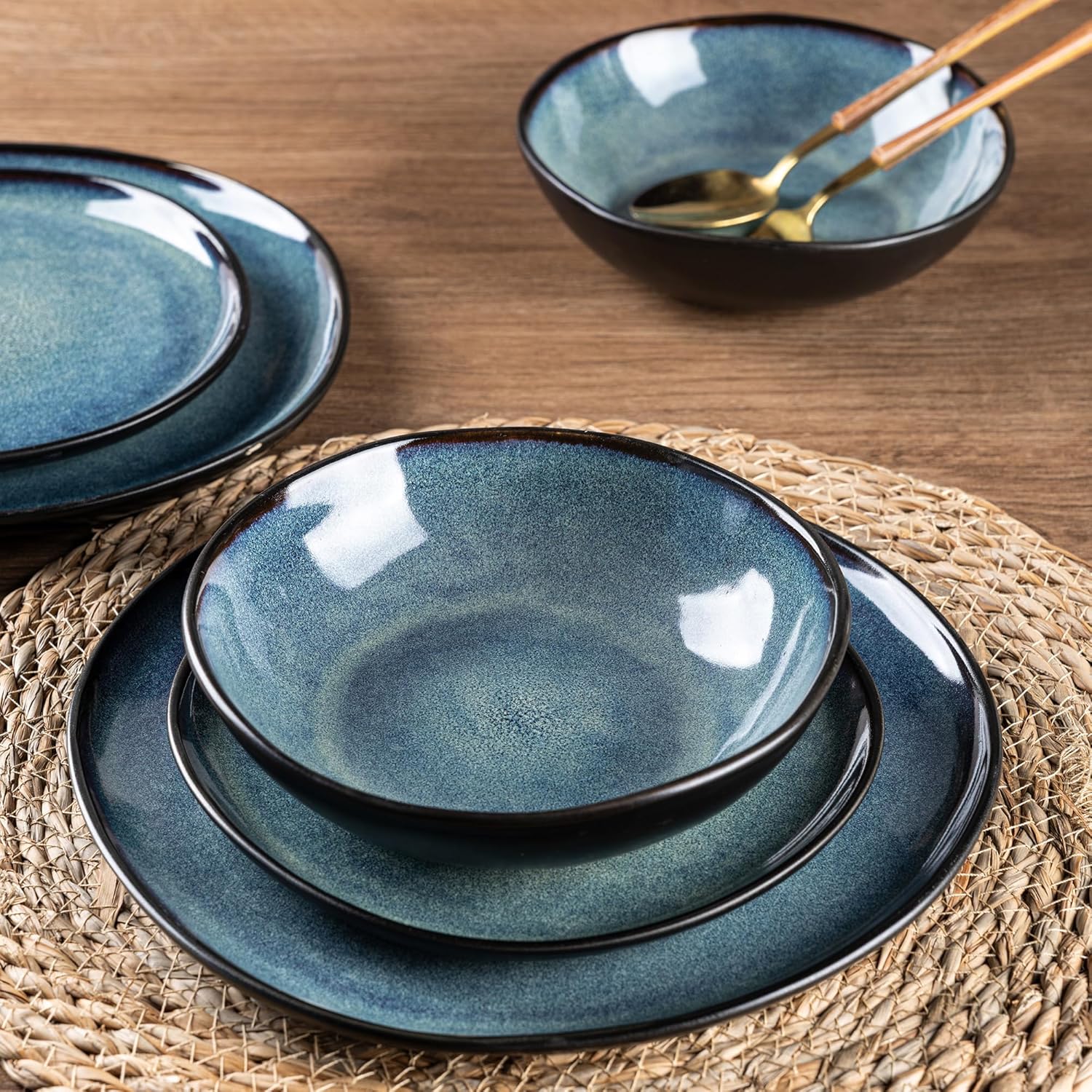 • EVERY PLATE IS UNIQUE: This dinerware set are fired with two different glazes, so the surface develops a beautiful color and makes your food look even more delicious.Since our glaze is all-natural, the surface of plates would change color on different lighting. The color may be a tad different from what you see in the images,but very item is betiful.Our glaze is also extra strong to prevent scratches from your knives and forks.