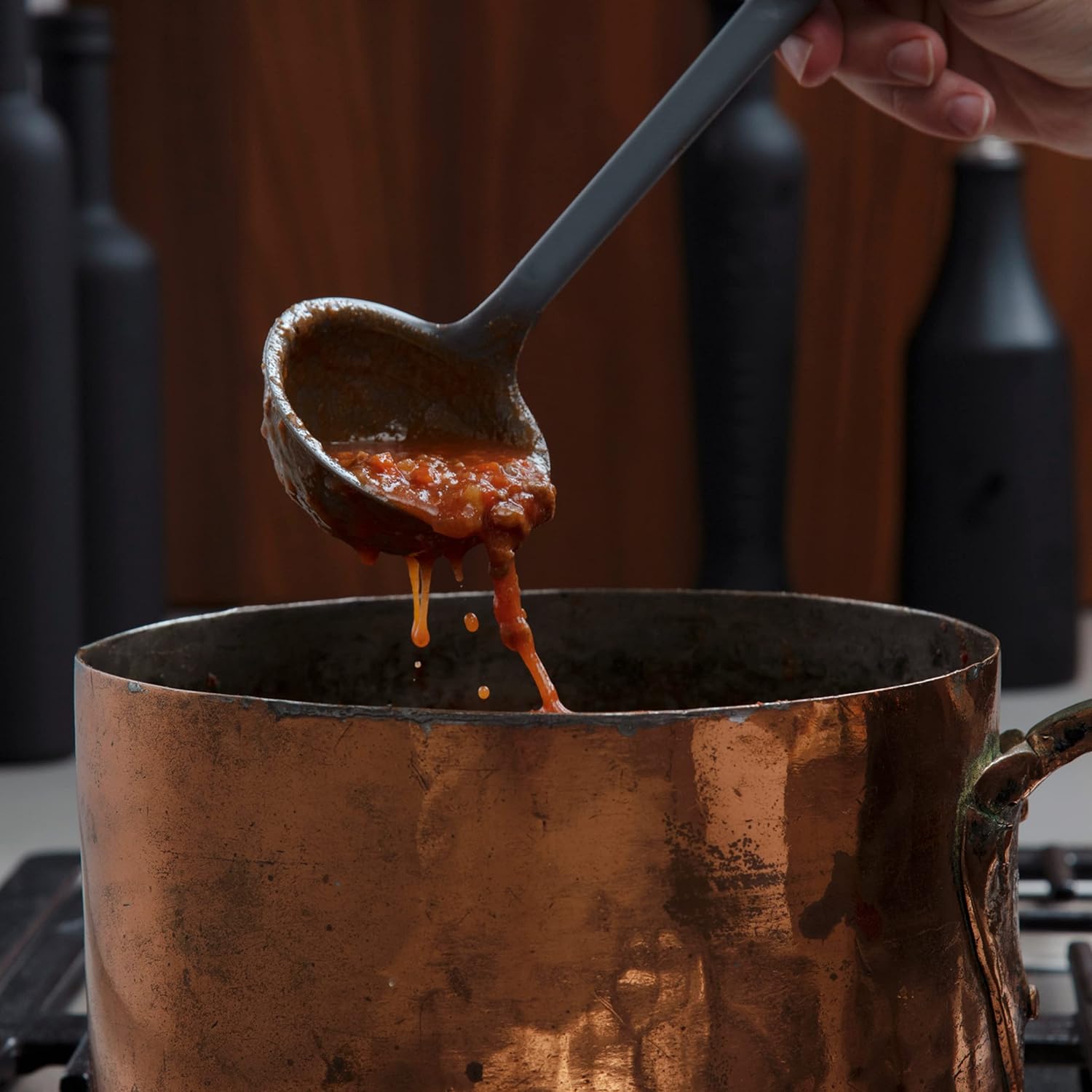 • Precision Pouring Ladle: The precision-edged Ultimate Silicone Ladle ensures no spills with its flexible front, perfect for scooping into any pot or pan's corners. Ideal for soups and more