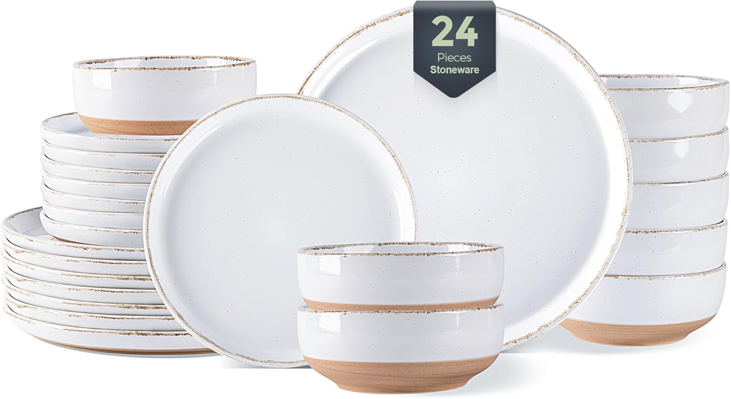 AmorArc 24 Pieces Ceramic Dinnerware Sets for 8, Handpainted Stoneware Plates and Bowls Set with Rustic Terracotta Underside, Scratch Resistant Dishes Set, Dishwasher & Microwave Safe, White